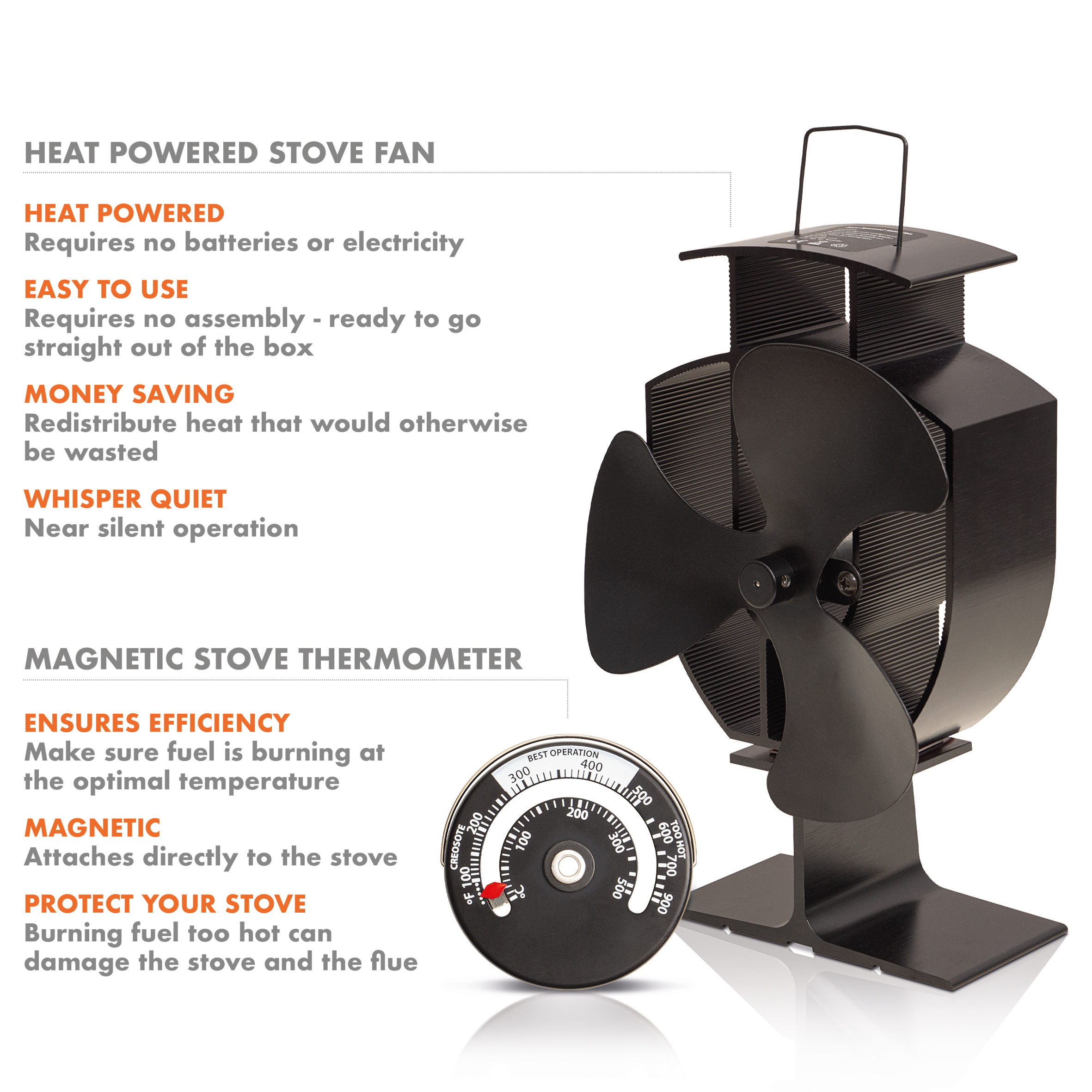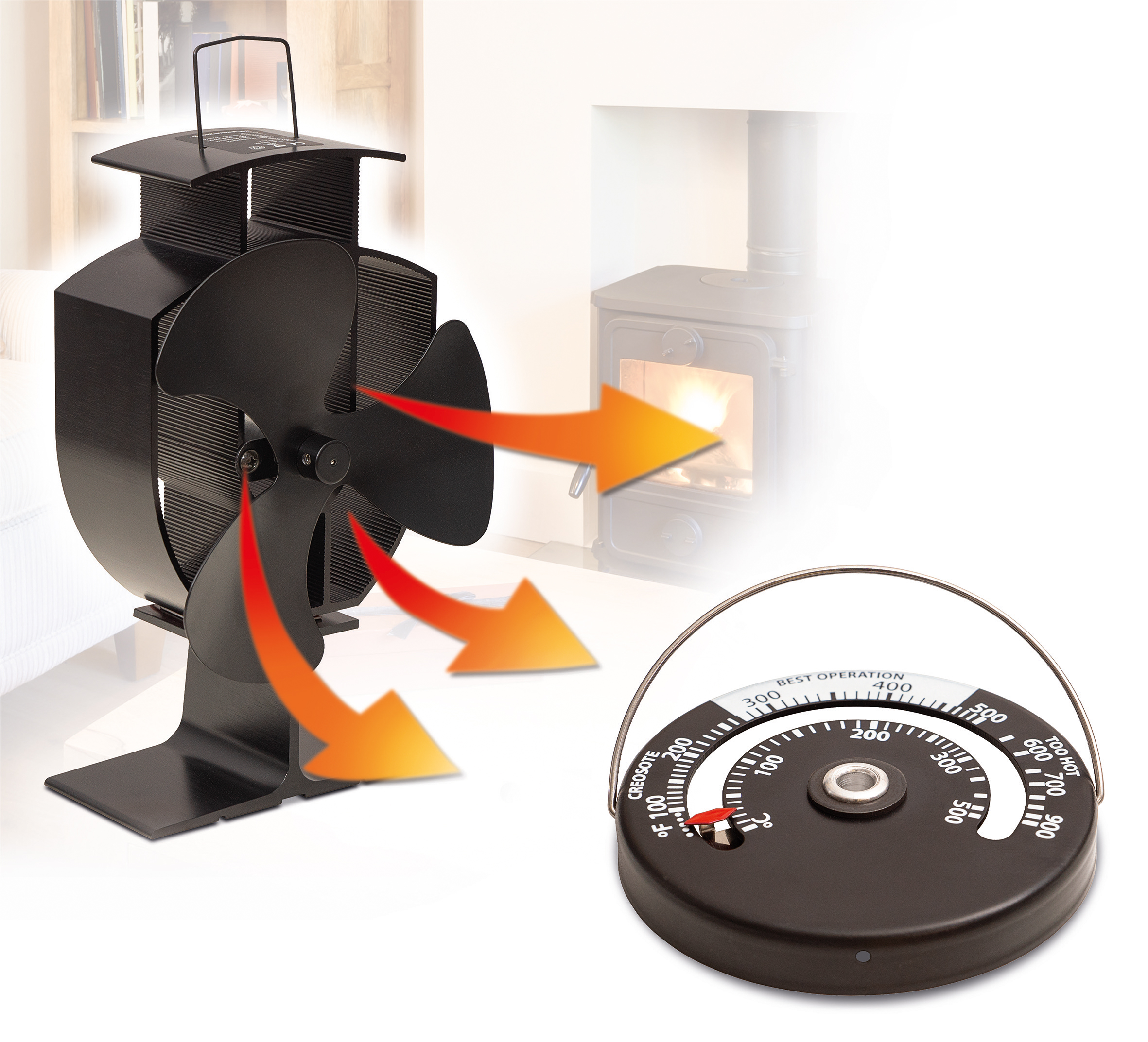 - A kit comprising of a Heat Powered 3 Blade Stove Fan and Log Burner Thermometer