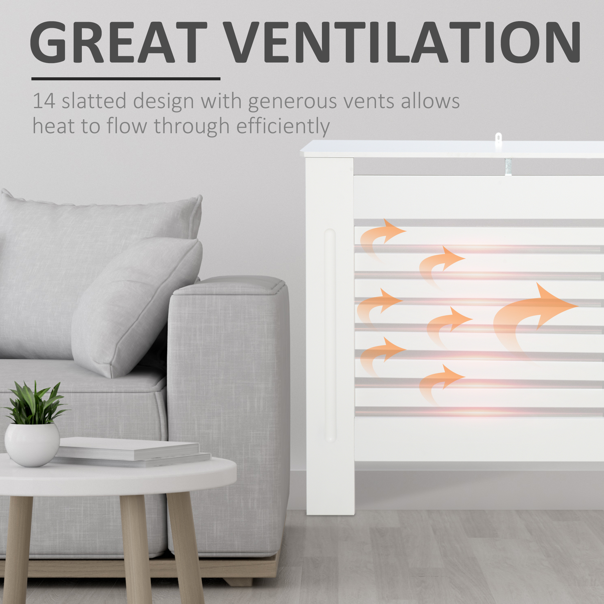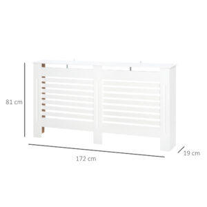 This modern radiator cover cabinet from HOMCOM is a designed to help hide old or unsightly radiator, protect hands from a hot surface and offer extra shelving for ornaments. The slatted design with sufficient vents allows for fluid heat flow while still preventing children and pets from touching the hot radiator surface. Manufactured from durable MDF in white finish for long term service, it is an elegant yet practical addition to your home and office.