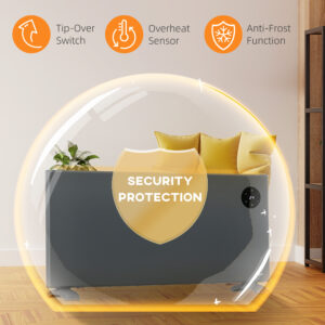- Auto-shut off: heater powers off if it overheats, topples over or if room temperature sharply drops