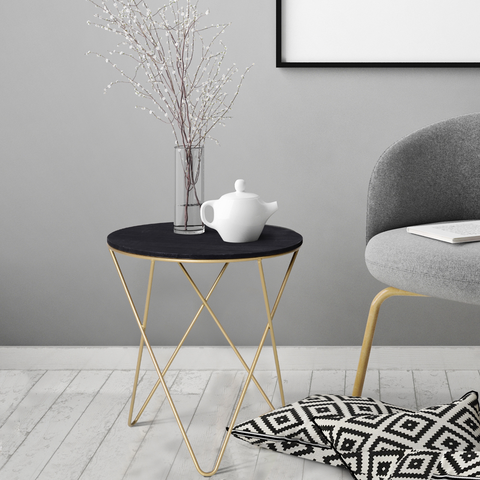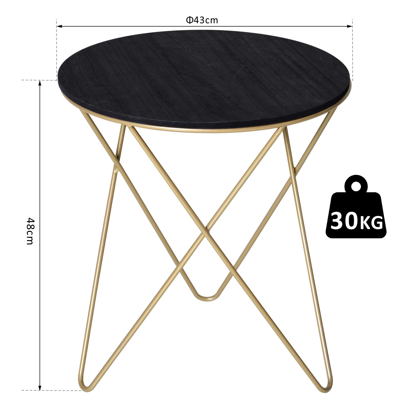 Bring subtle, yet stunning elegance into your home with this round end table from HOMCOM. Using metal for a frame which is tough and stable, the black coffee table is crafted in a cross-over reverted triangle shaped design, giving it a unique look which catches the eye immediately. Contrasting with the muted gold tone of the frame, the black MDF tabletop provides a reliable place to keep drinks, magazines, plates etc. close to you, with its 43cm diameter ensuring you have plenty of room.