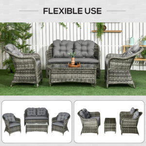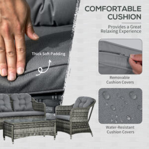 Bring the whole family together outdoors this summer, thanks to this conservatory furniture from Outsunny. It comes with two chairs, a double sofa and table. The frames of the garden furniture sets are made from tough and durable aluminium, wrapped in weather and fade resistant rattan for double the protection and durability. Outdoor furniture is easy to clean to keep it fresh and beautiful. Finished with seat and back cushions on each piece – you’ll find it hard to get out once settled in.