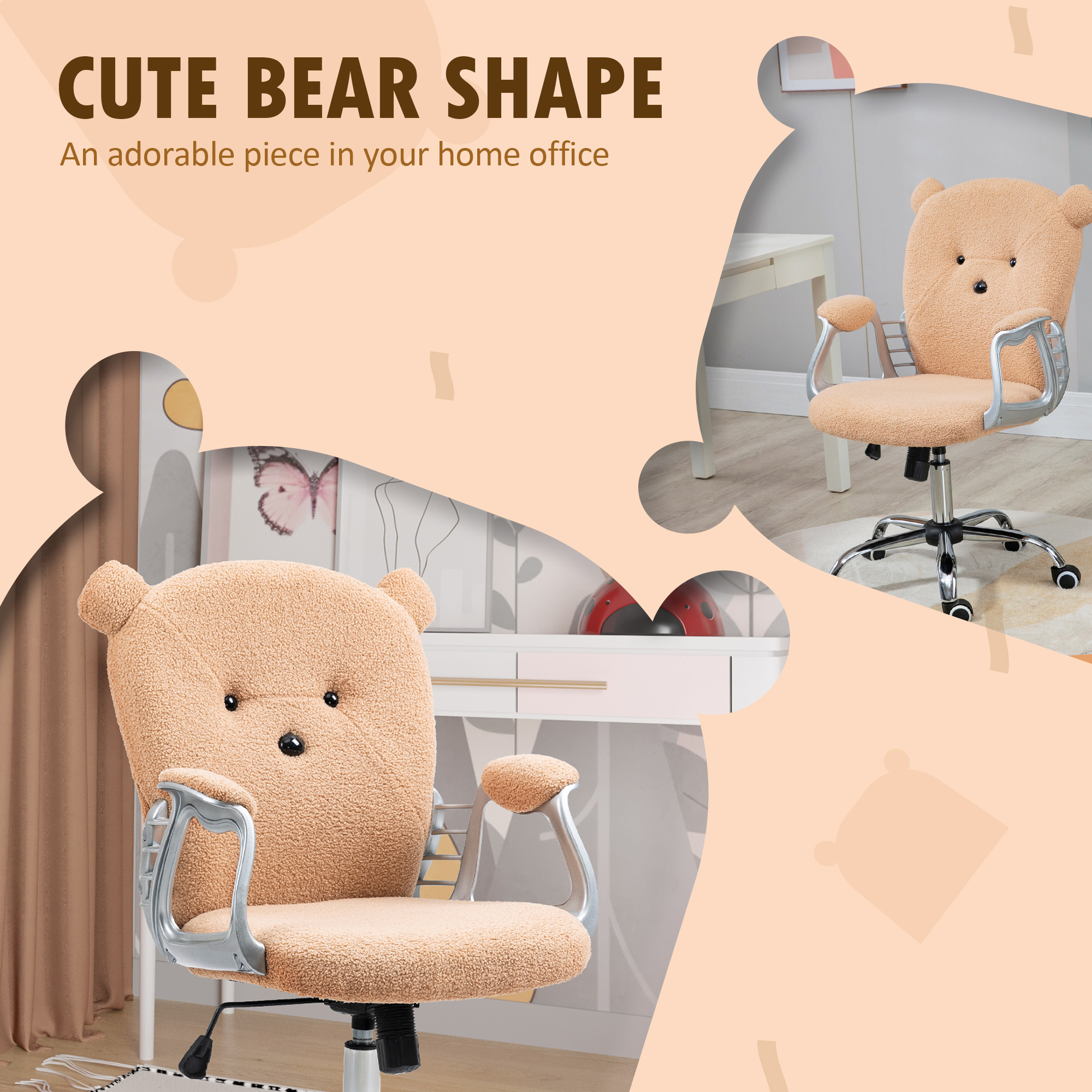 Cute times ahead during your working times, with Vinsetto. Not just a comfy chair, it comes shaped as an adorable teddy bear, with the back and beads. The height is adjustable between 48-58cm, so you can sit at a level which works for you best. The seat is padded for comfort; it also moves side-to-side freely – working with your body as it moves naturally – helps to prevent any stress or strain. Complete with five wheels.