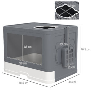 - Overall dimensions: 36.5H x 48.5L x 38Wcm. Inside space: 35H x 48L x 37Wcm. Front door: 19H x 33Wcm. Top door: 18L x 16Wcm. Storage box: 12.5L x 5W x 5Dcm. Tray: 46L x 35W x 8Dcm. Scoop: 27L x 11W x 3.5D. Cat brush: 12H x 22Wcm. Folded (disassembled): 12.5H x 48.5L x 38Wcm