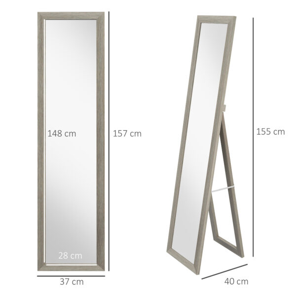 A home essential, in a simple and stylish design: this HOMCOM standing floor mirror. A durable MDF frame in a wood-effect finish makes it beautiful; looks great in all bedroom styles. The long mirror is super reflective so you can see yourself easily – great for getting ready and seeing your outfit! Attach it to the wall with the brackets, let it stand with the back leg: set it up how you want.