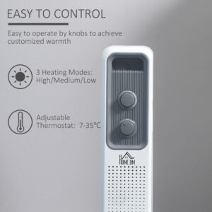 Keep warm with this oil filled radiator from HOMCOM. With an adjustable temperature of 7-35?? and three heating modes, you’re in control of the heat you want. The overheating and tip-over function will turn it off safely, so you can enjoy this portable radiator with peace of mind. Move with minimum fuss using the wheels and handle, making sure no room goes cold. It’s complete with a cable organizer for tidiness. Get a cosy winter by HOMCOM electric radiator.