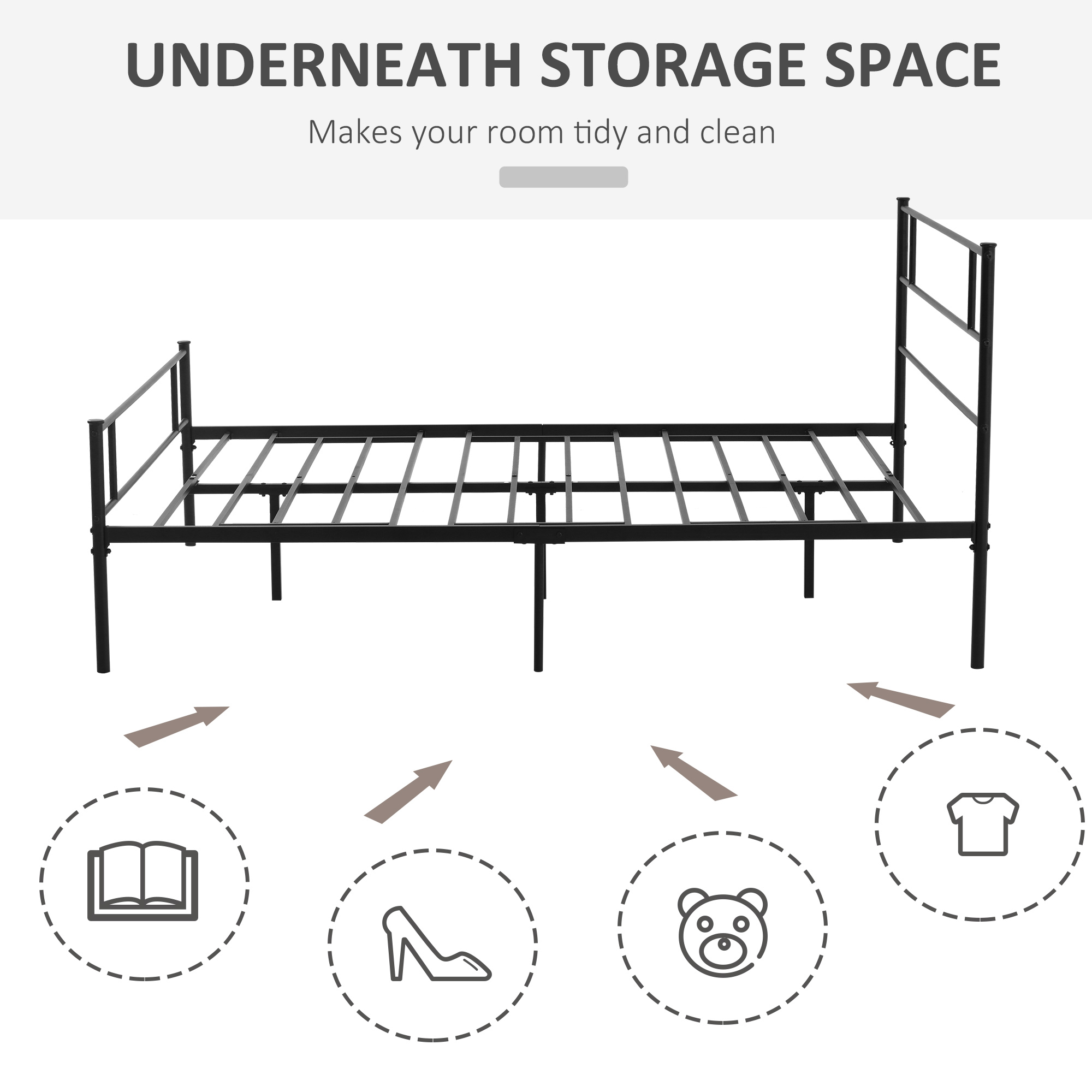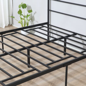 Make dream times minimal with this bed frame from HOMCOM. The slim-cut frame, in a matte black finish makes it suitable for practically any bedroom space – whatever your interior decor. Made from metal with sturdy legs, this frame will keep you supported so you can rest and relax in peace – with the built-in slats and tall headboard holding your mattress in place at all times. Comes with spacious under-bed clearance, giving you handy, out-of-sight storage space.