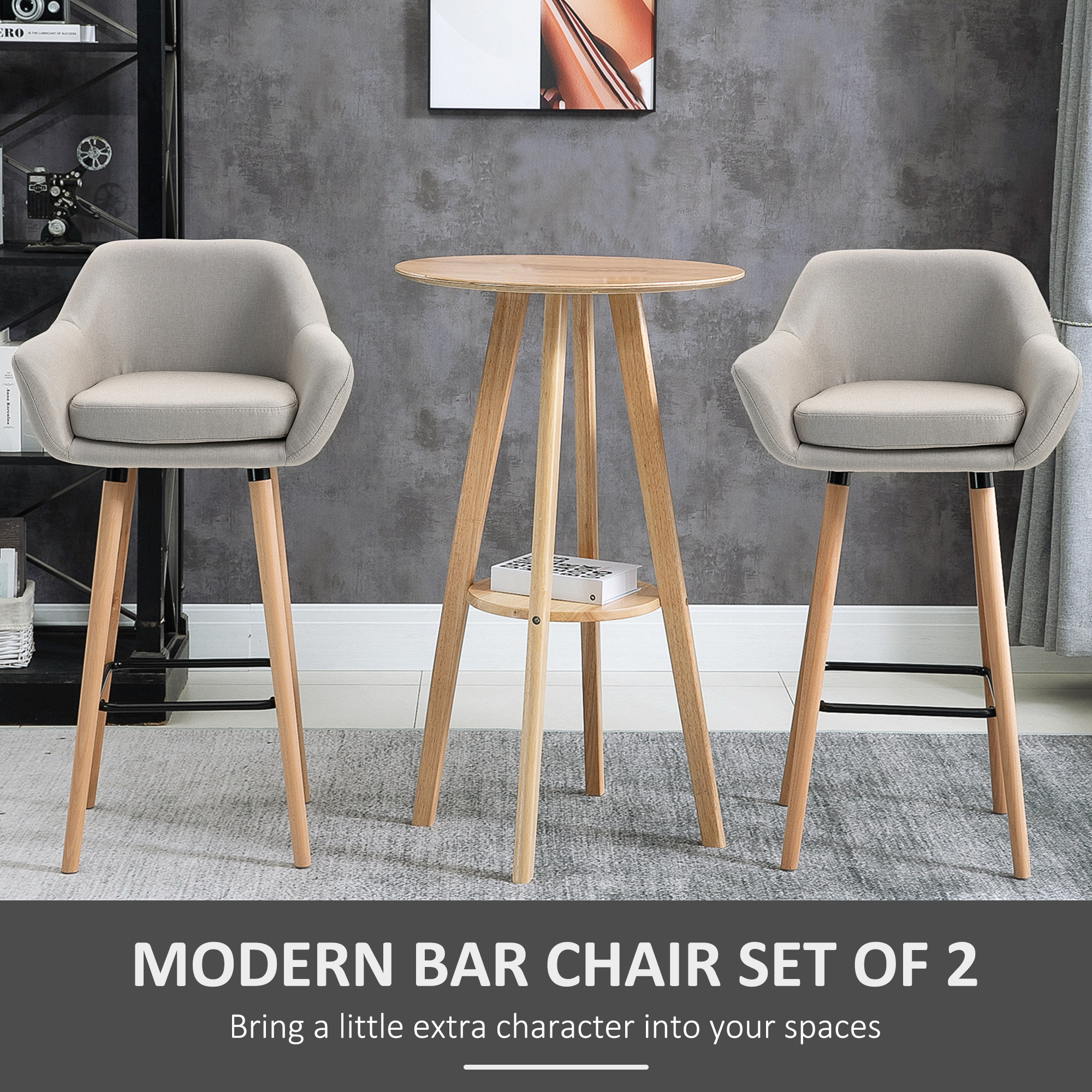 Let modern elegance take the forefront in your home seating, thanks to this set of two bar stools from HOMCOM. Linen upholstery is stylish and allows the skin to breathe naturally. Solid wood legs for full support, with lower footrests to elevate the lower body. Tub shaped seats add to the style, with a padded seat for comfort. Mid-rise backs offer a touch of support when you lean back. Comes in a set of two for a matching dining area look.