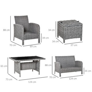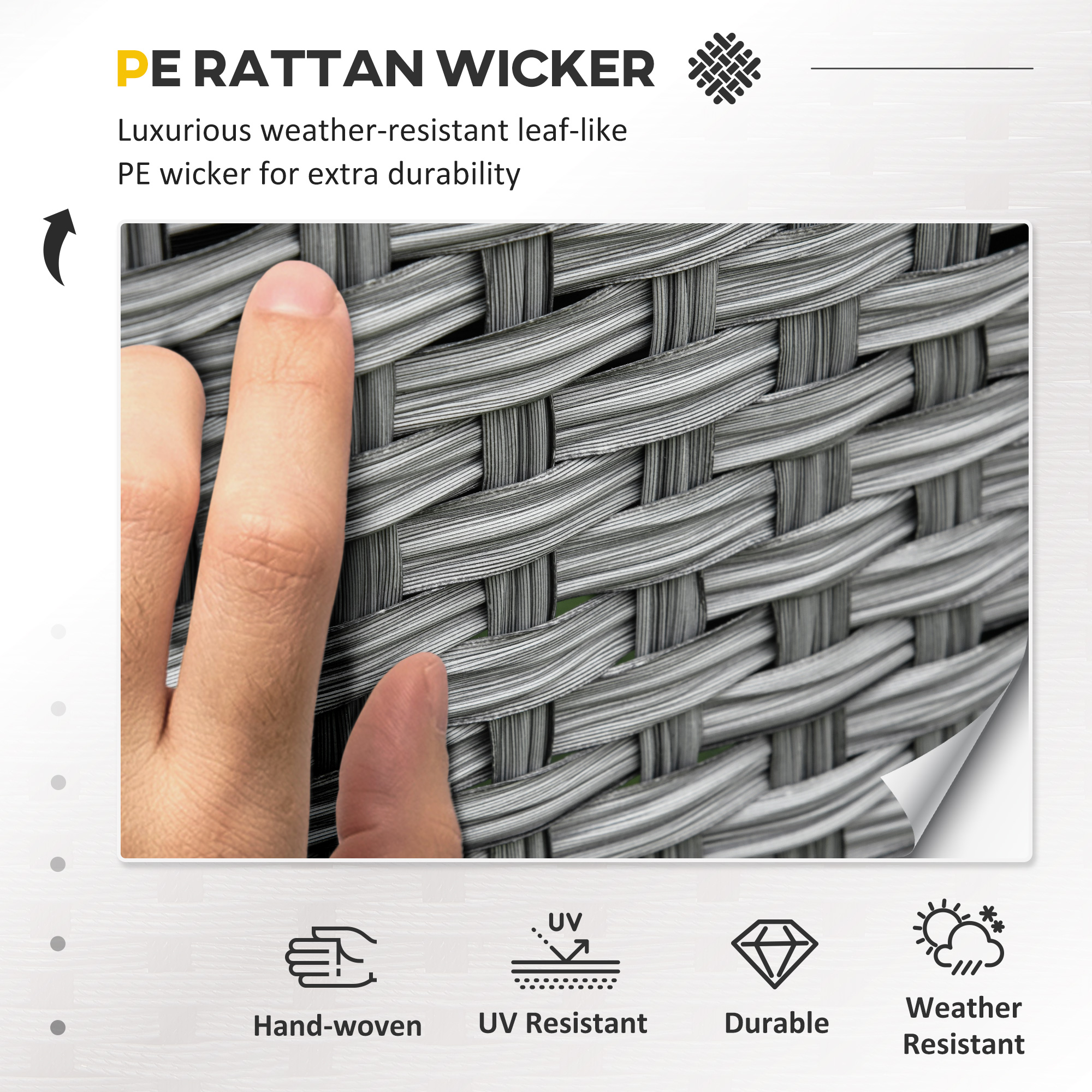 Bring your closest together outdoors this summer with this dining set from Outsunny. This six-piece set holds up to six people with the two armchairs, two footstools and two-seater sofa. The table provides spacious dining and holding room, whilst the footstools are great for relaxingly elevating your feet and legs. The frames of each piece are made from tough powder coated metal for a solid base, wrapped in weather and fade resistant PE wicker for double the protection and durability. Set is finished with a tempered glass table top which is solid and sleek.