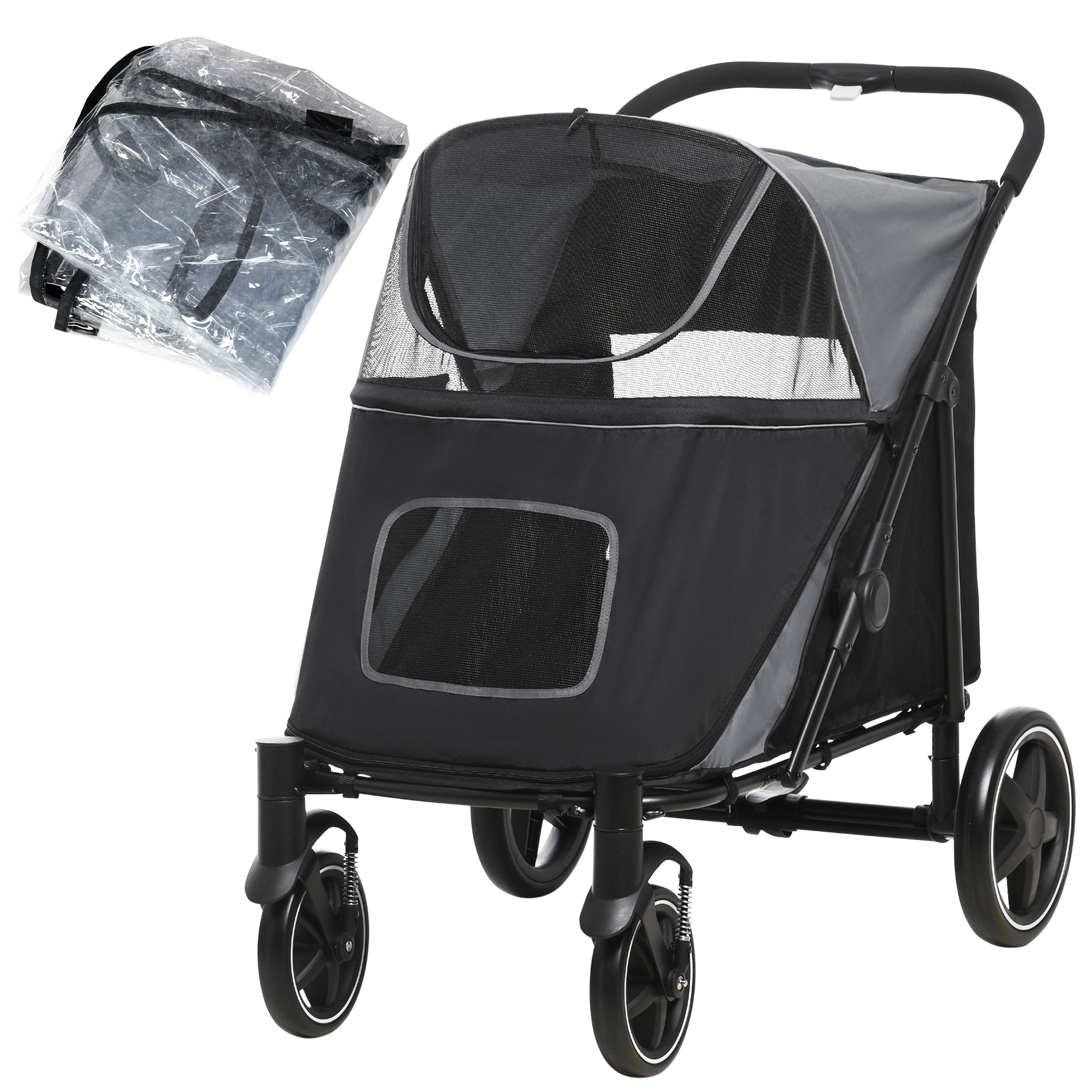 Going out should be smooth and simple for you and your pets ?? this PawHut pet stroller makes sure of it. They’ll sit in this spacious buggy, enjoying the wind flow through the mesh windows, keeping them cool and comfortable. The leashes ensure they’re secure, whilst the EVA wheels with shock absorbers make their ride a lot smoother. To prevent the bad weather from disrupting travel plans, we prepare the rain cover for this dog pram to make sure you travel great, have an adventure with PawHut!