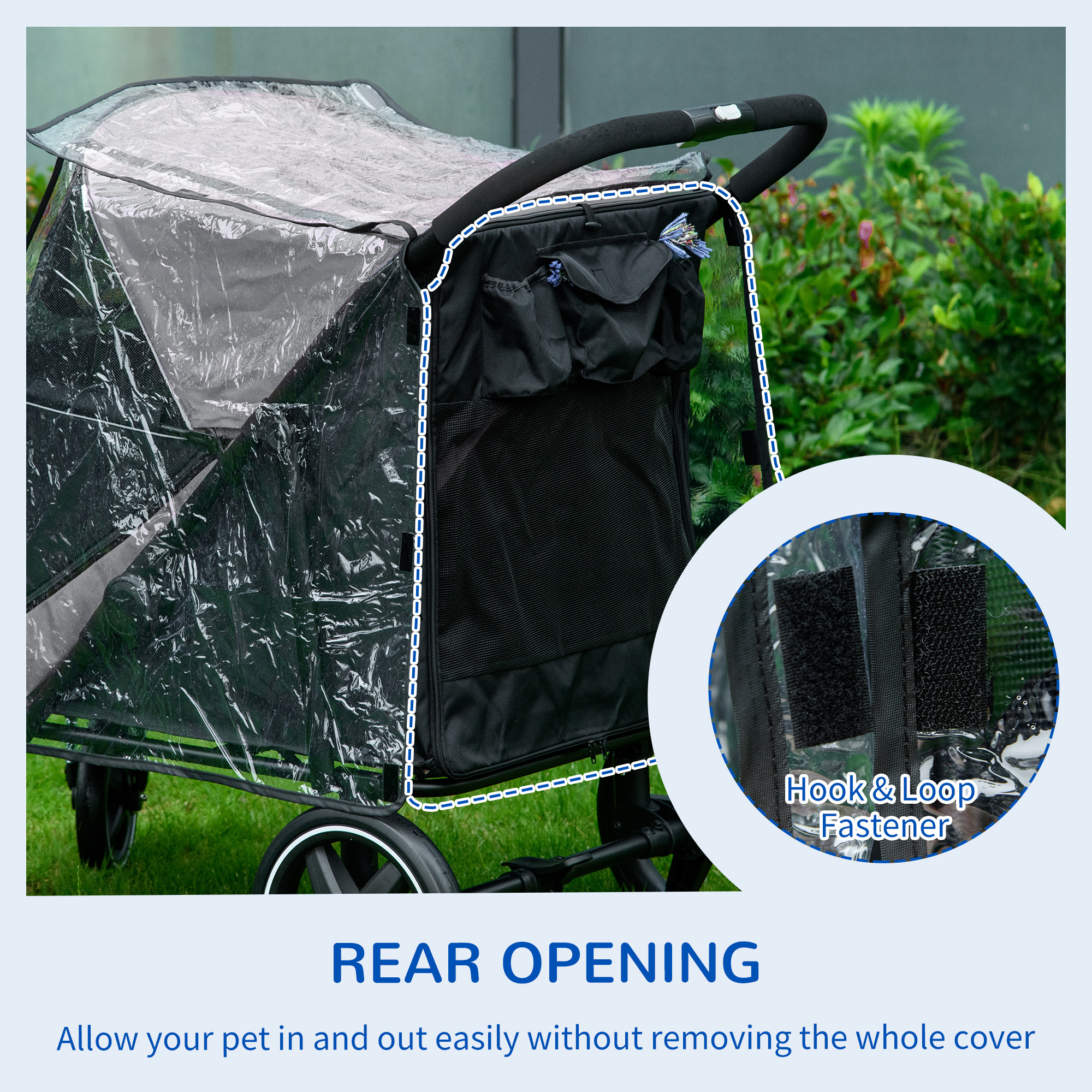 - Rain cover has a rear opening for pets, providing easy access