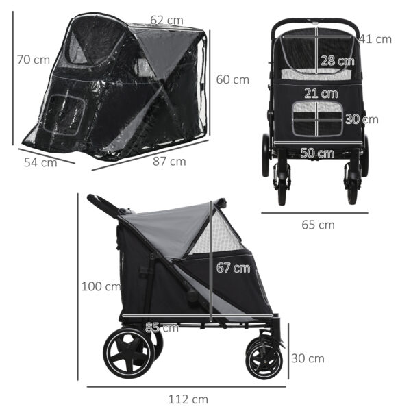 Going out should be smooth and simple for you and your pets ?? this PawHut pet stroller makes sure of it. They’ll sit in this spacious buggy, enjoying the wind flow through the mesh windows, keeping them cool and comfortable. The leashes ensure they’re secure, whilst the EVA wheels with shock absorbers make their ride a lot smoother. To prevent the bad weather from disrupting travel plans, we prepare the rain cover for this dog pram to make sure you travel great, have an adventure with PawHut!