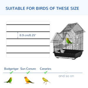 Upgrade your pet’s home with this PawHut bird cage. Birds will rest on the two perches or the swing ring, where they’ll flap and stretch their wings in this spacious habitat ?? they won’t feel boxed in. The pull-out tray at the bottom makes cleaning a breeze, keeping their living space tidy and comfortable. Food and water are provided through the two small doors and food containers, whilst the other large door provides easy access. Invest in their happiness and comfort ?? and watch them thrive.