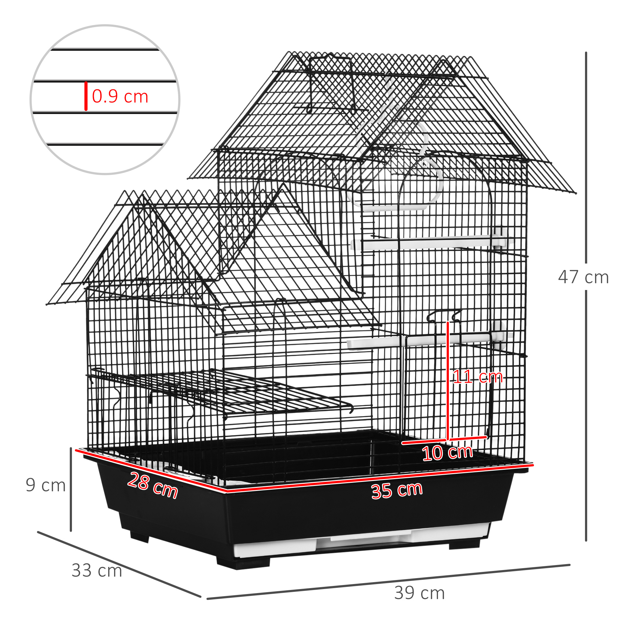 - Two plastic perches, two food containers and a plastic swing ring, keeping birds happy when inside