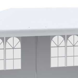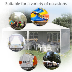 This marquee gazebo with sides is a great item to shelter when entertaining guests. It’s formed of a steel frame for a tough structure, with a durable plastic canopy roof and side shell – there is no front for an open feeling. Six guy ropes and 12 ground pegs are included to make the party gazebo pin to the ground for extra stability. For many events like BBQS, family parties, wedding receptions, BBQs and more. Finished with handy adjustable feet.