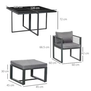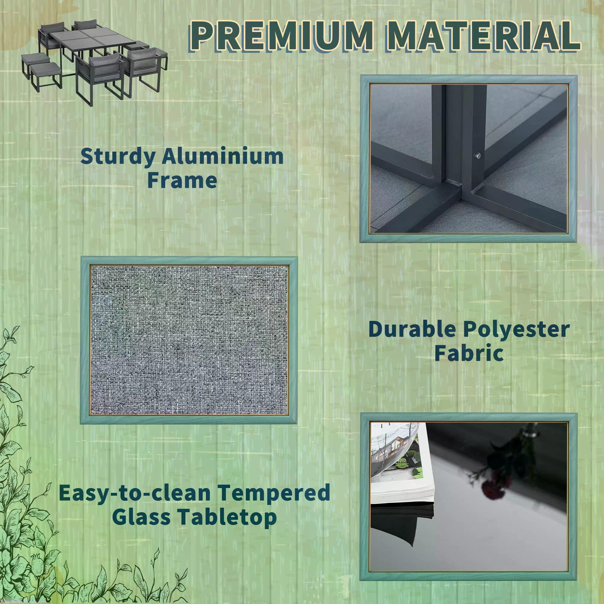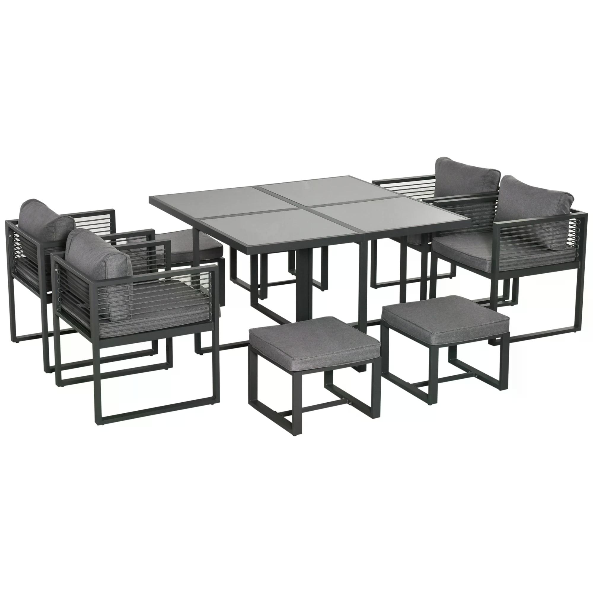 - 9 piece patio dining furniture seats 8 people: 1 x table, 4 x armchair, 4 x footstool