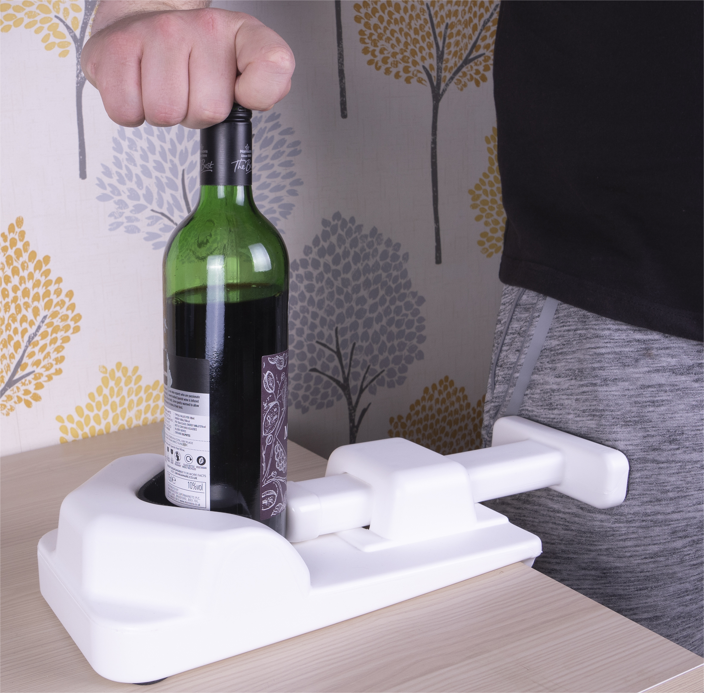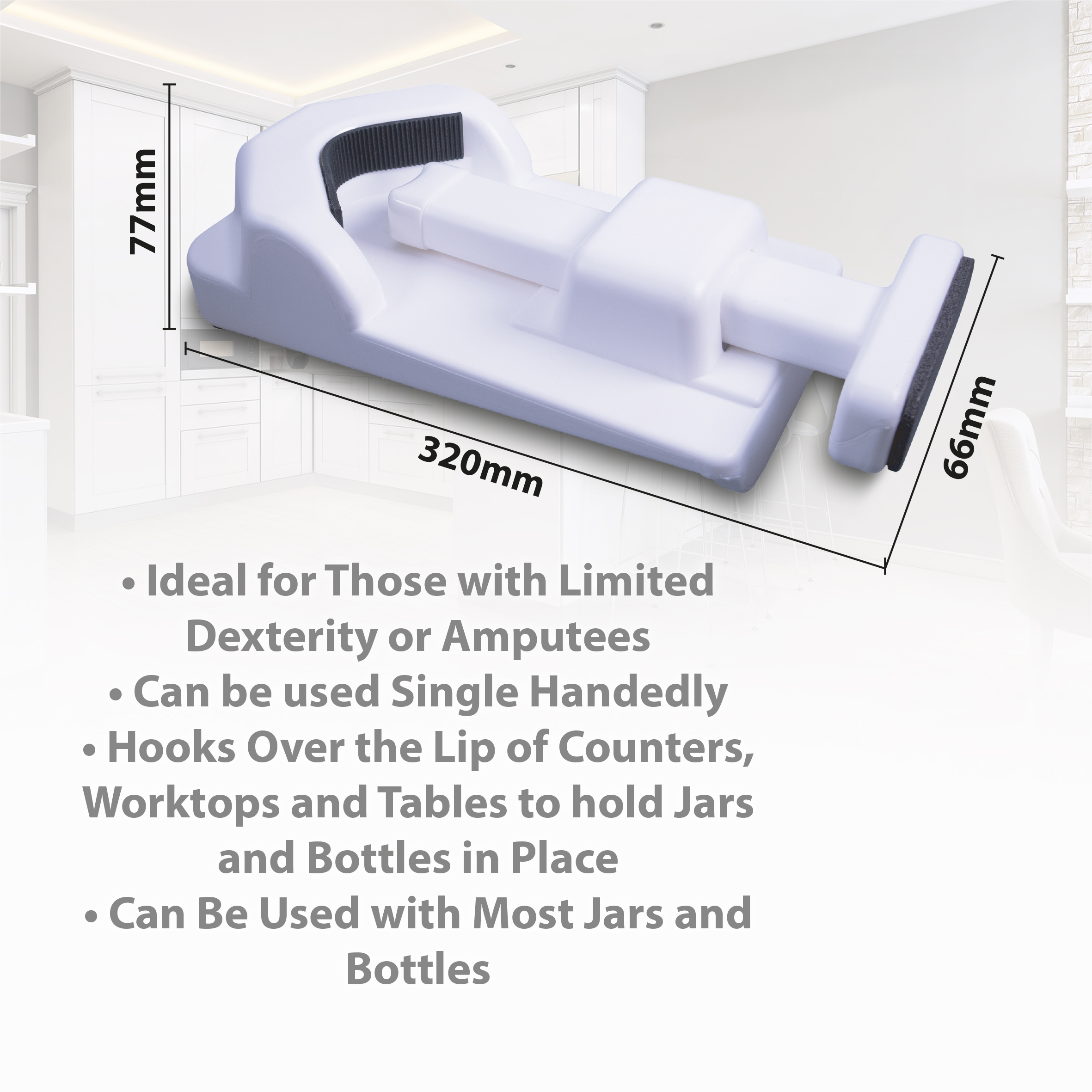 The jar and bottle holder enables the user to open caps easily and is ideal for those with limited dexterity and weakness in the arm or hands. The jar and bottle holder can also be used single-handed. It is dishwasher safe and features a padded push bar for comfort and non-slip strips for ease of use.