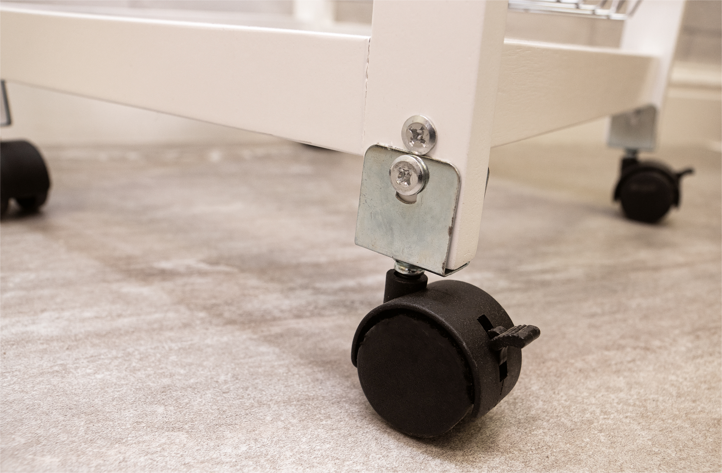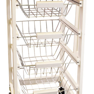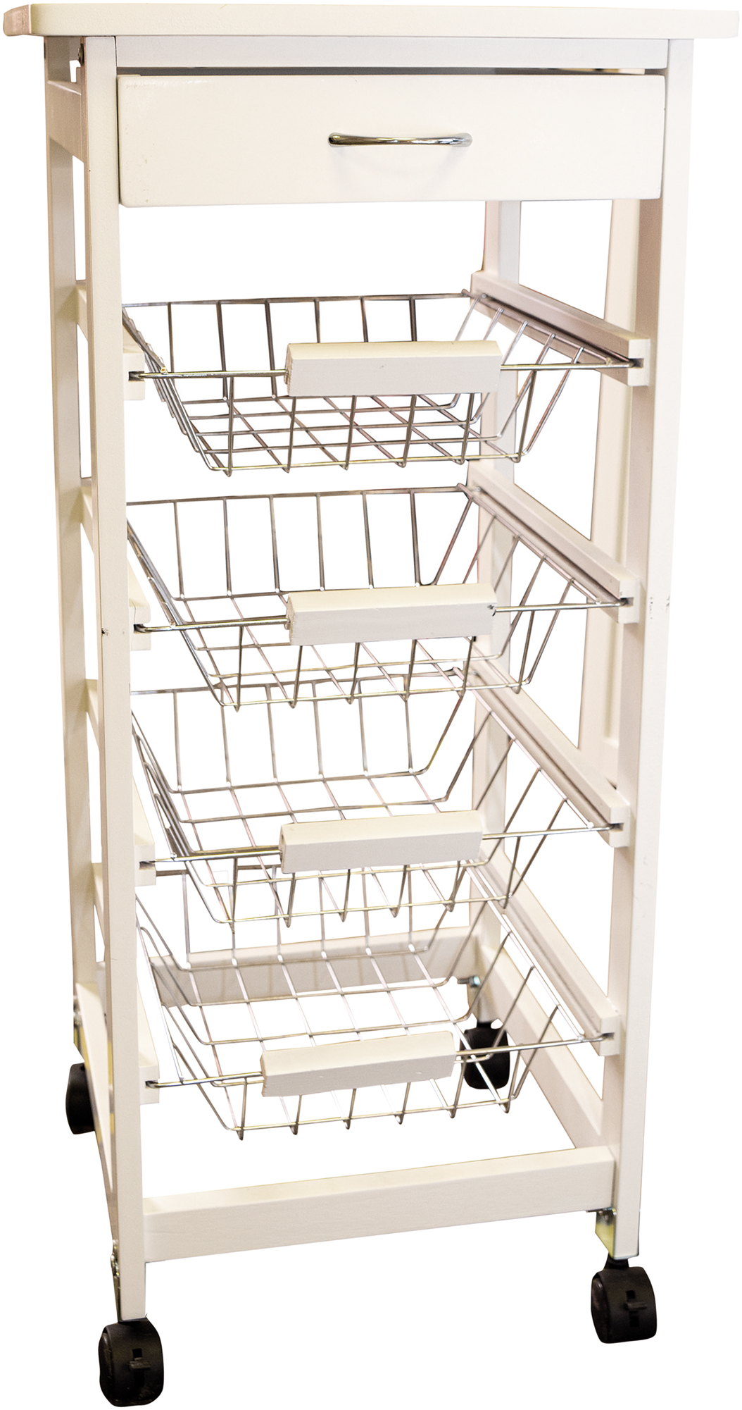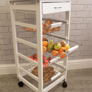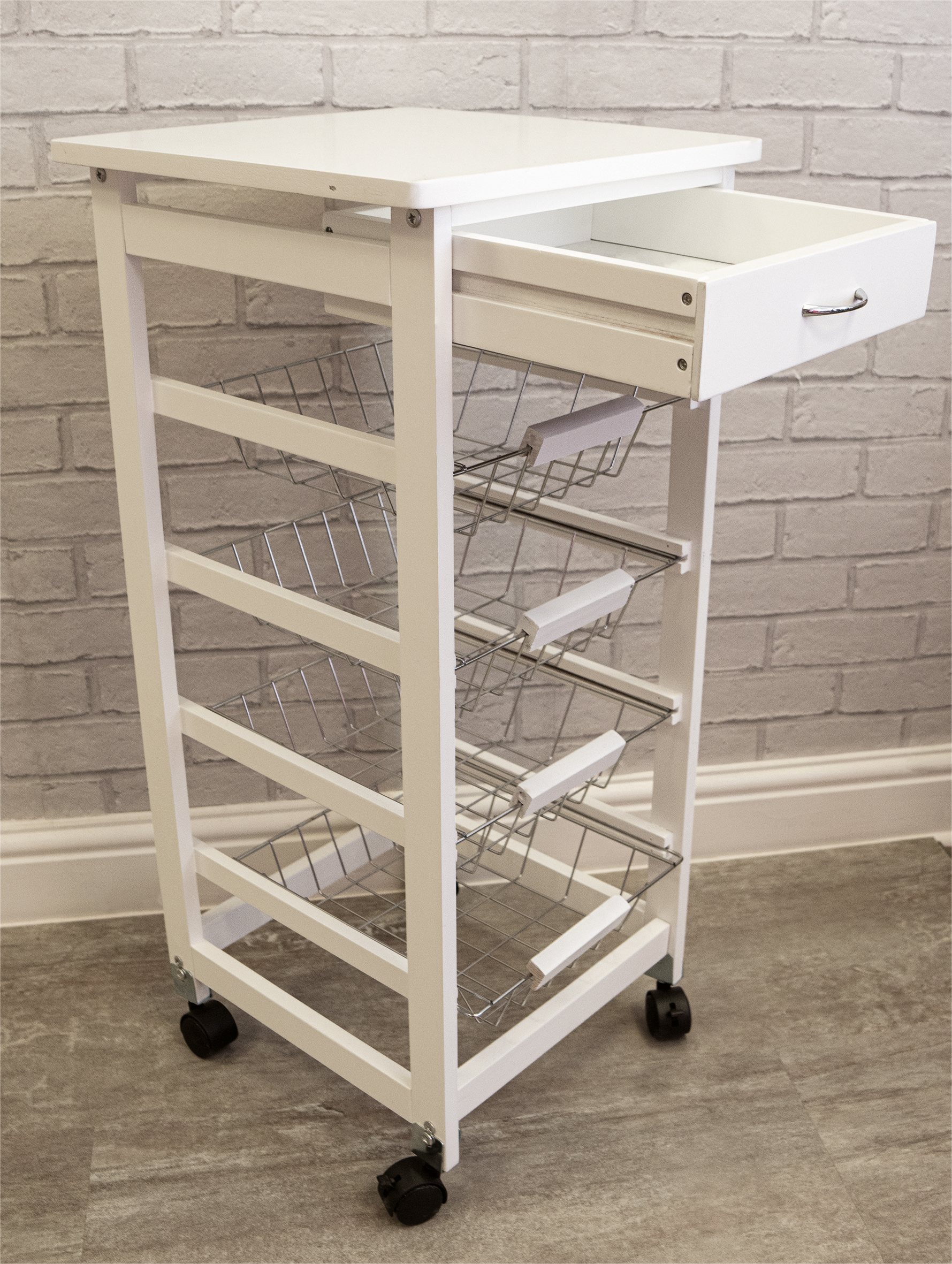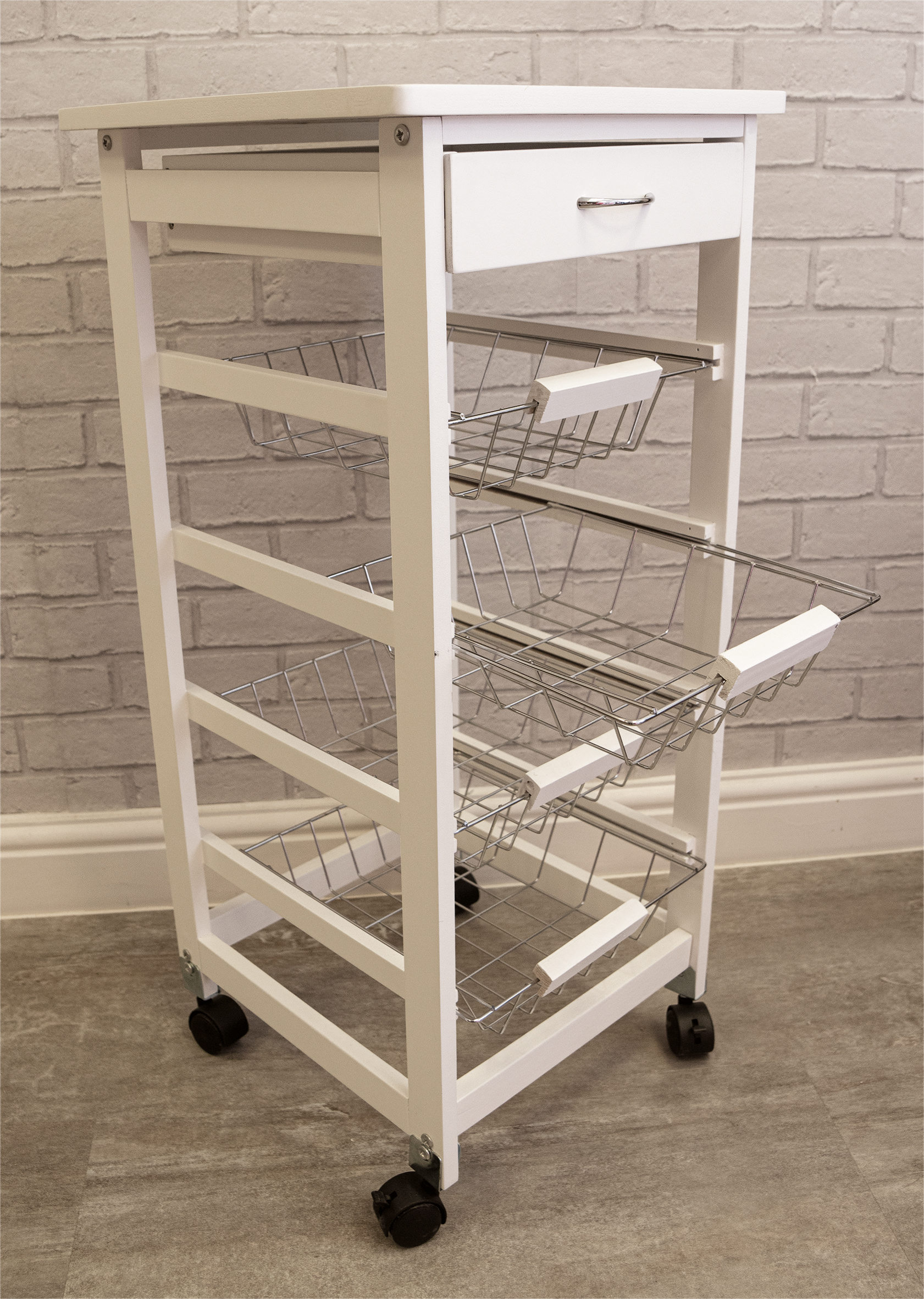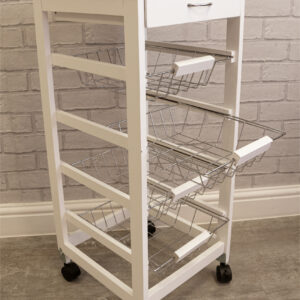 The kitchen trolley from St Helens Home and Garden is perfect for providing much needed kitchen storage space. The trolley features a counter top which can be used as extra space for appliances such as kettles and toasters or alternatively it can be used as a chopping or serving space. There are 4 wire pull out storage baskets which are neatly tucked away under the trolley each with a 25.5cm depth, they provide extra storage space for items such as fruit and vegetables or non perishable goods like tins and cereals. There is also a pull out drawer with handle which is handy for storing knives, cutlery or utensils. The 4 castors mean the trolley can be transported easily around your kitchen and 2 of the castors can be locked to ensure the trolley does not move when you dont want it to. The white finish gives the trolley a stylish and clean look making it suitable for any kitchen regardless of your colour scheme.