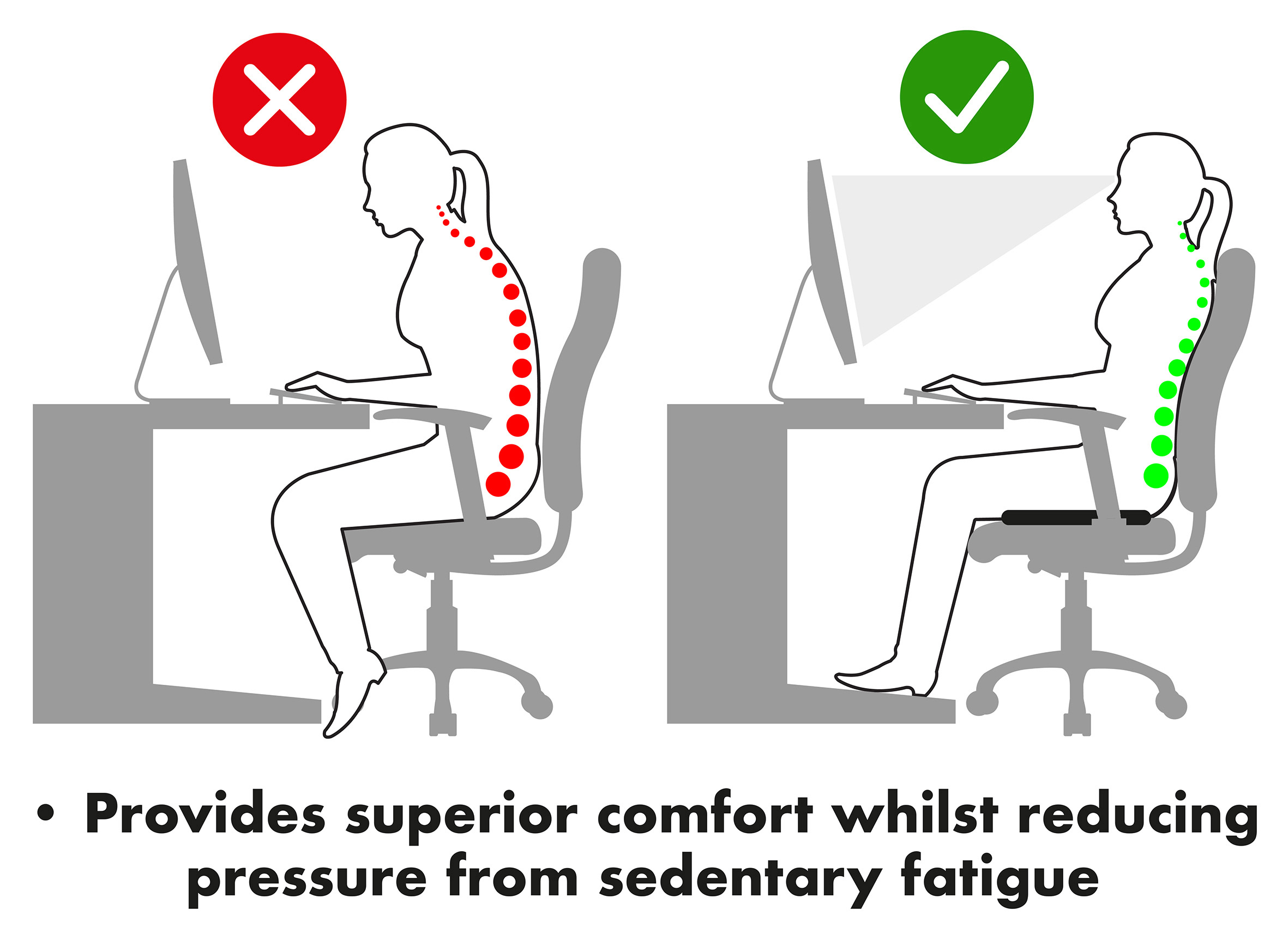 - PRESSURE RELIEF; Unique design eases pressure from sedentary fatigue, cut-out suspends the coccyx without pressure