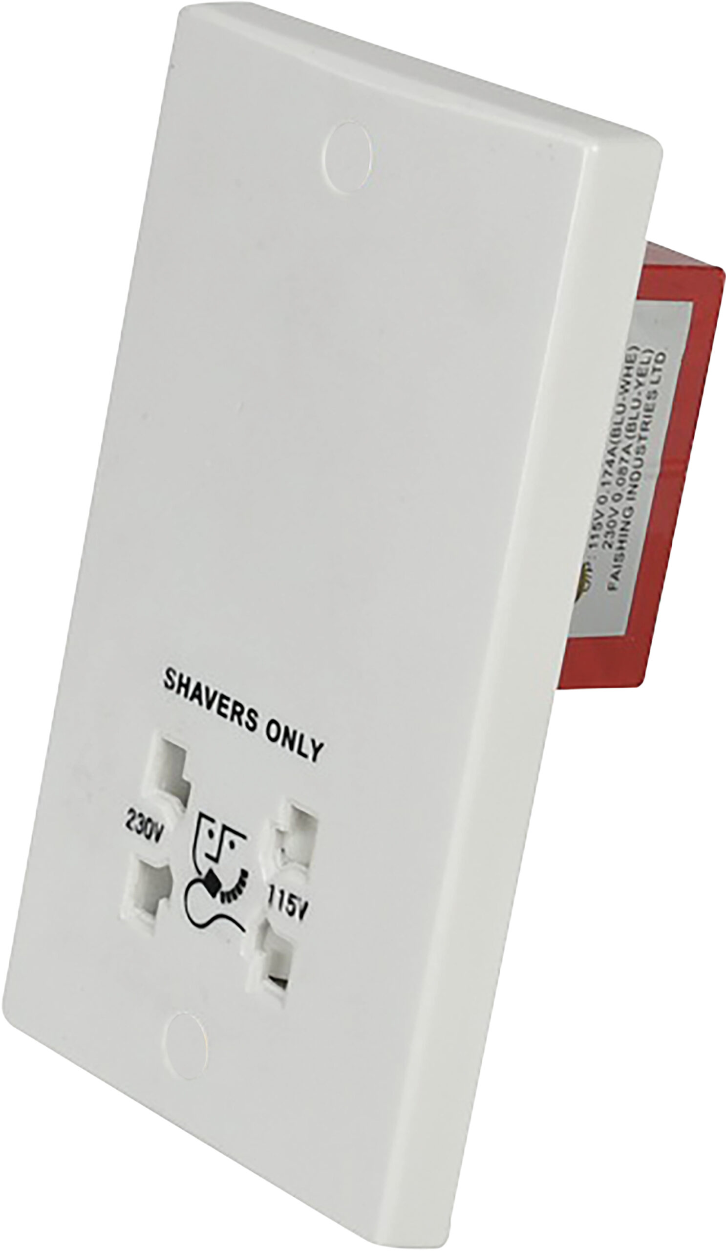 Shaver Socket Curved Edge Finish. Dual Voltage 115V/230V. Plate Material: Urea. Operating temperatures -5dC to 40dC.