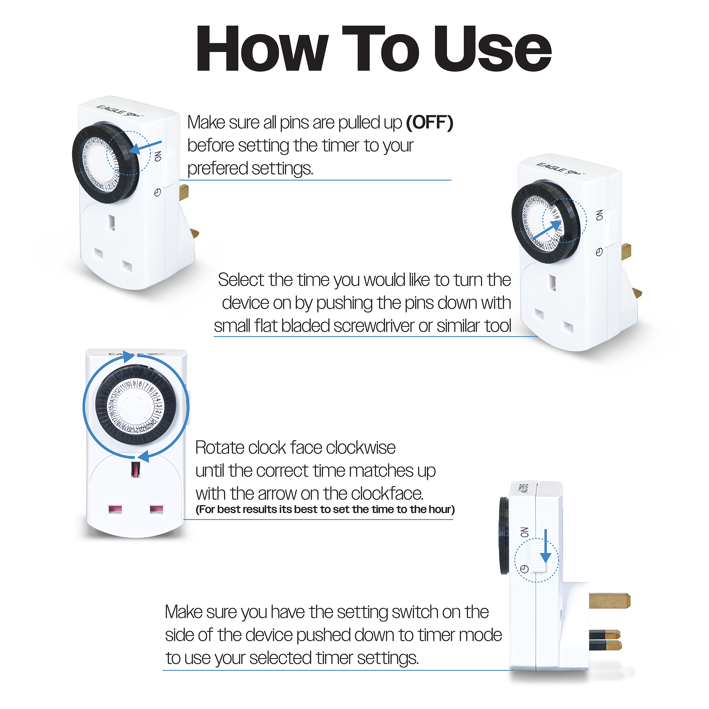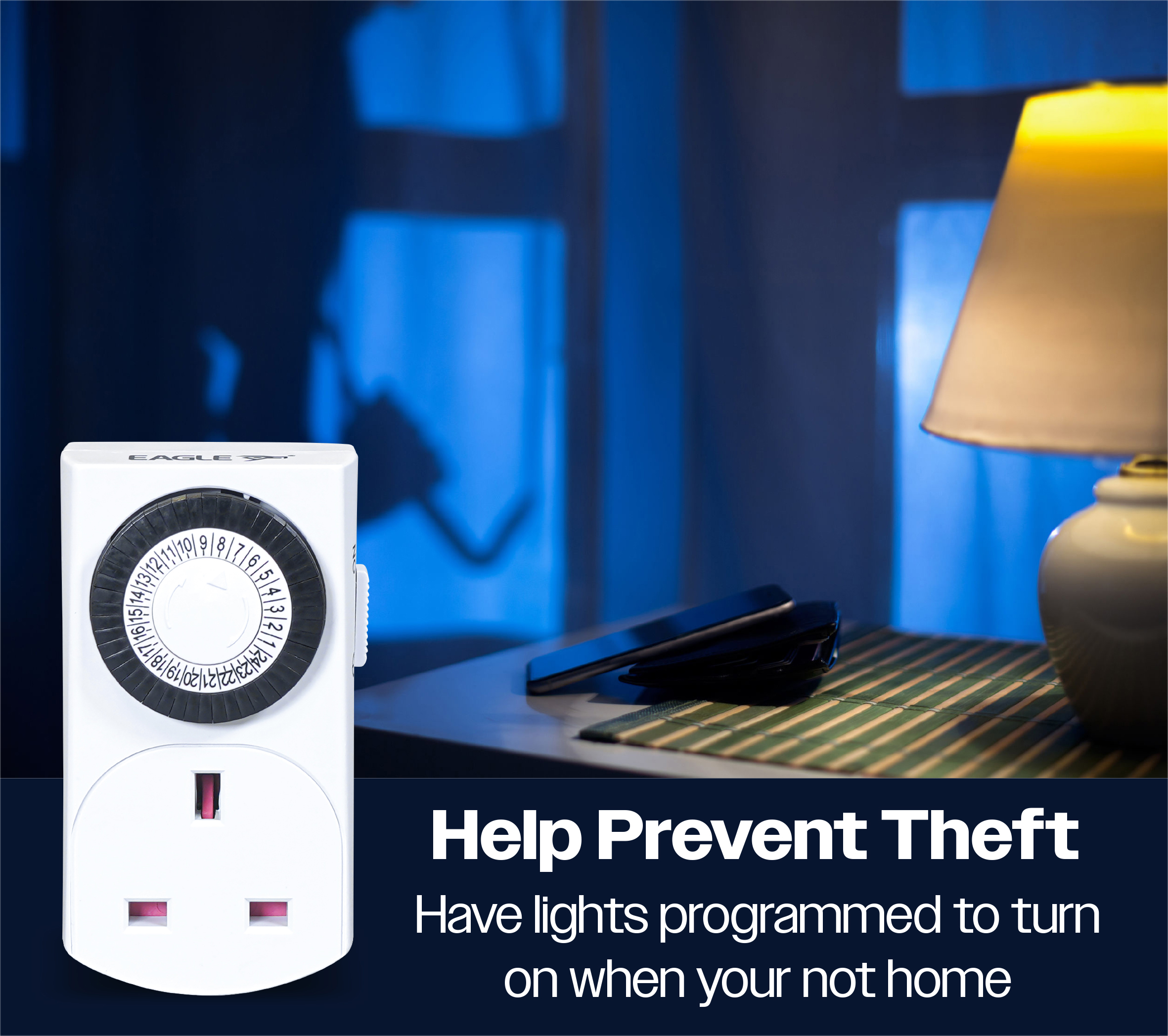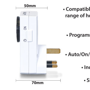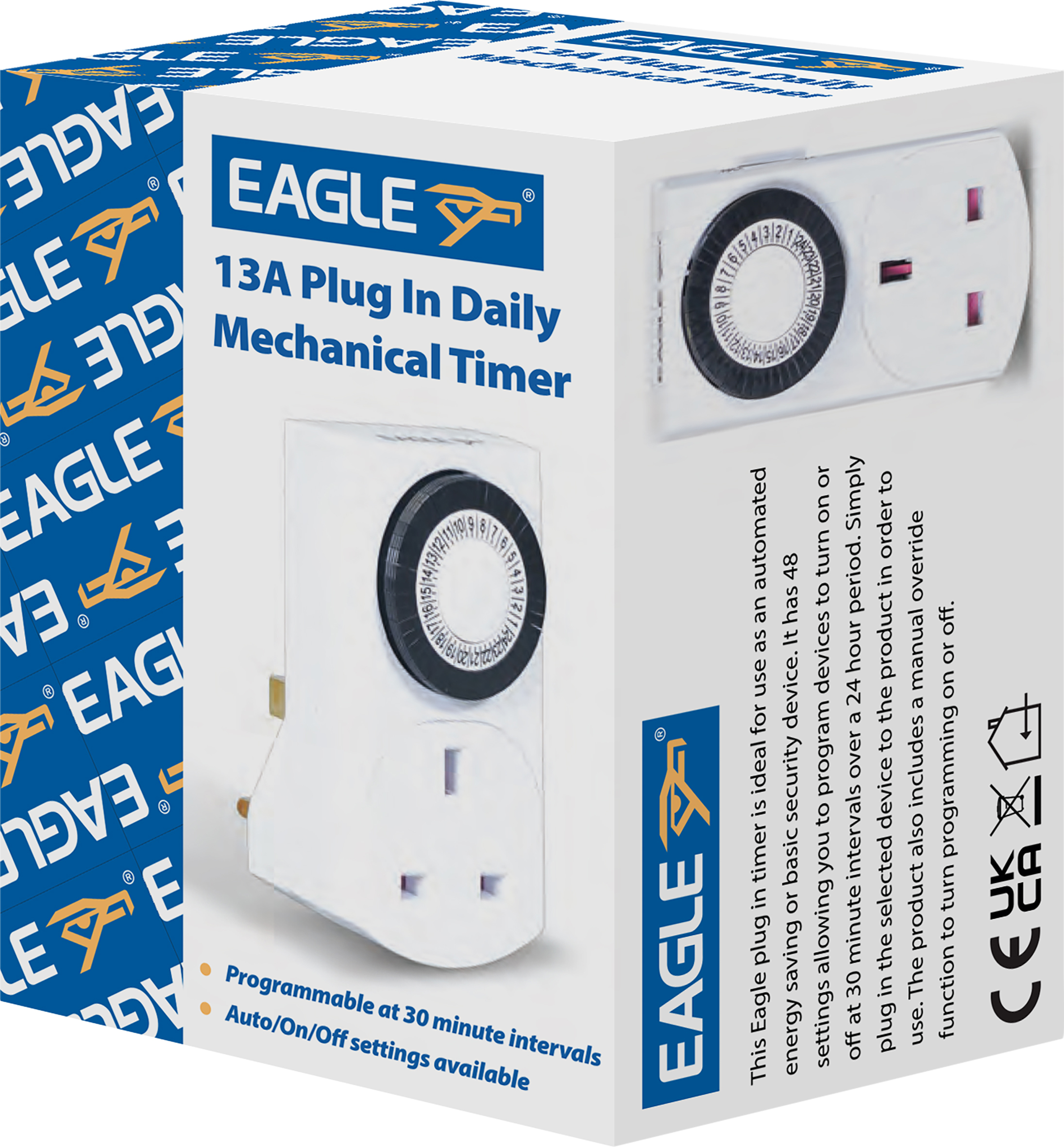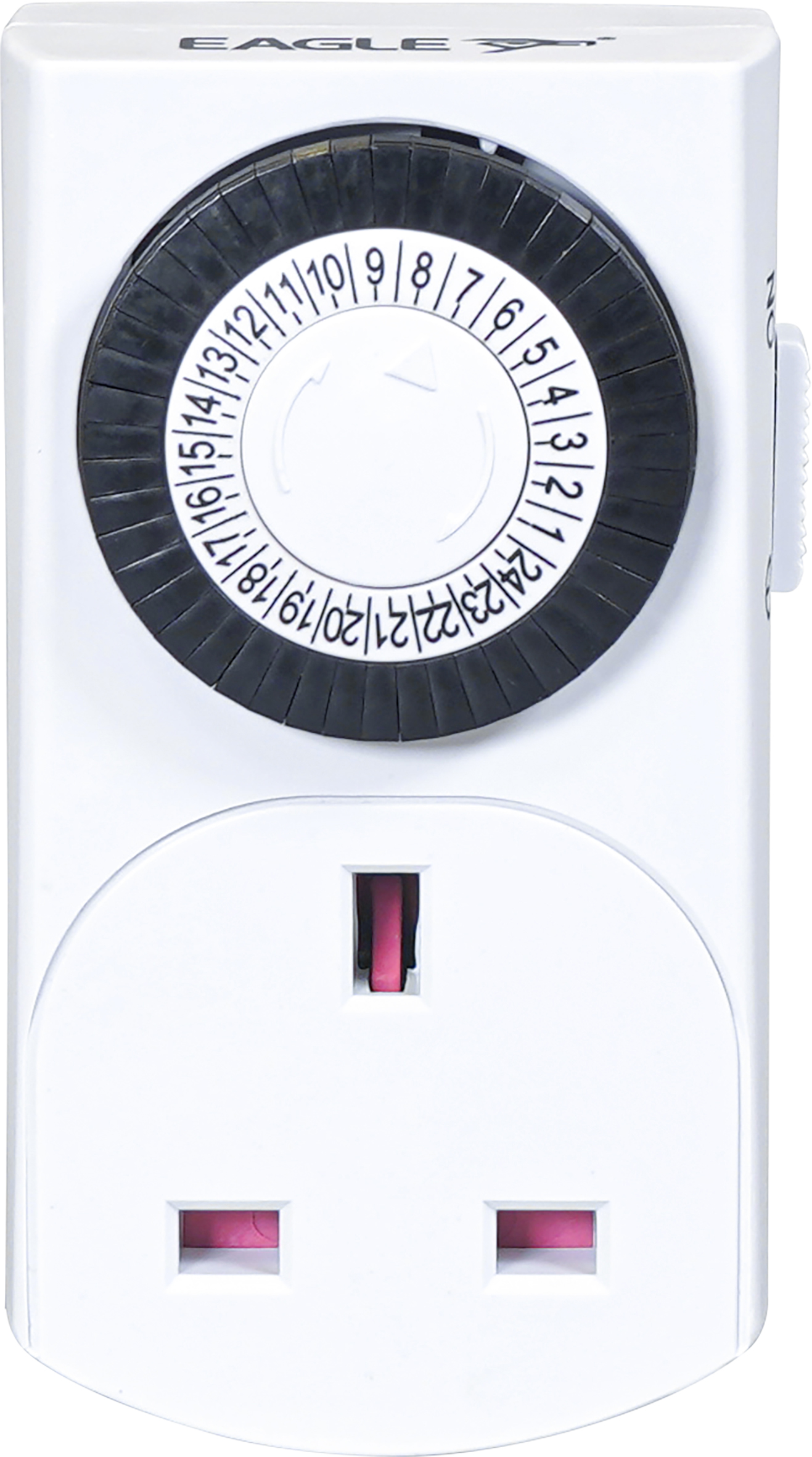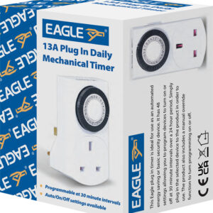 This Eagle plug in timer is ideal for use as an automated energy saving or basic security device. It has 48 settings allowing you to program devices to turn on or off at 30 minute intervals over a 24 hour period. Simply plug in the selected device to the product in order to use. The product also includes a manual override function to turn programming on or off.
