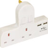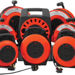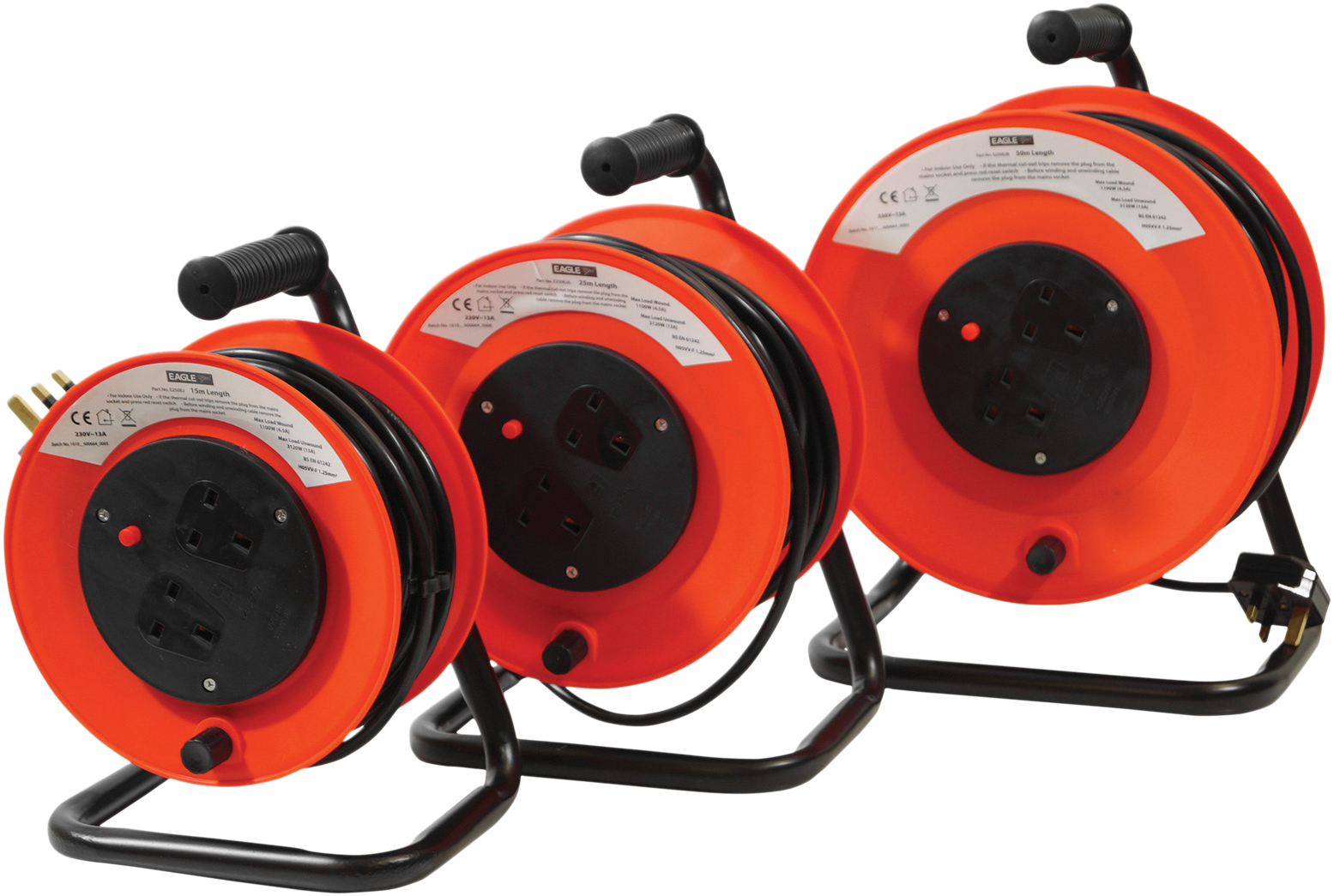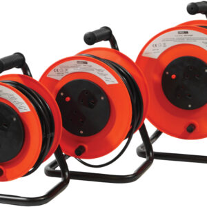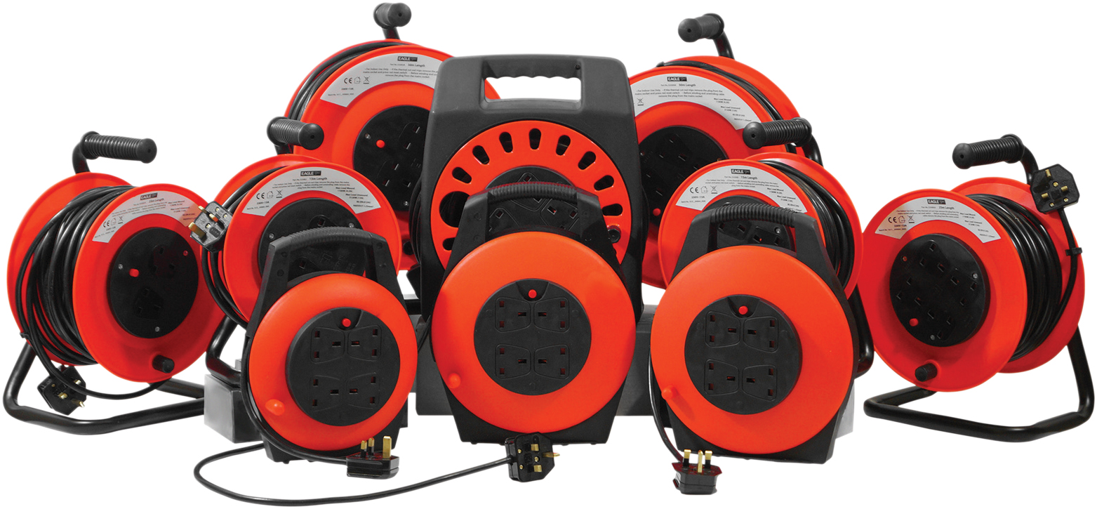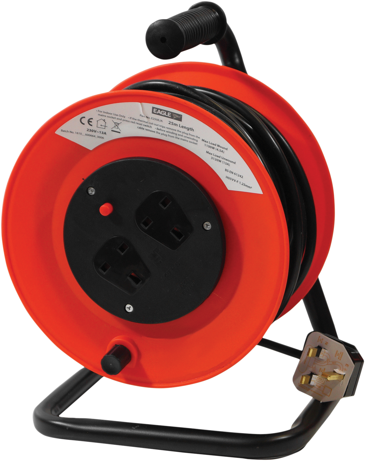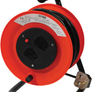 A Red and Black 2 socket extension reel with stand, carry handle and overload cut-out with reset button. Maximum current when fully wound is 4. A. Maximum current when used fully unwound is 13 A.