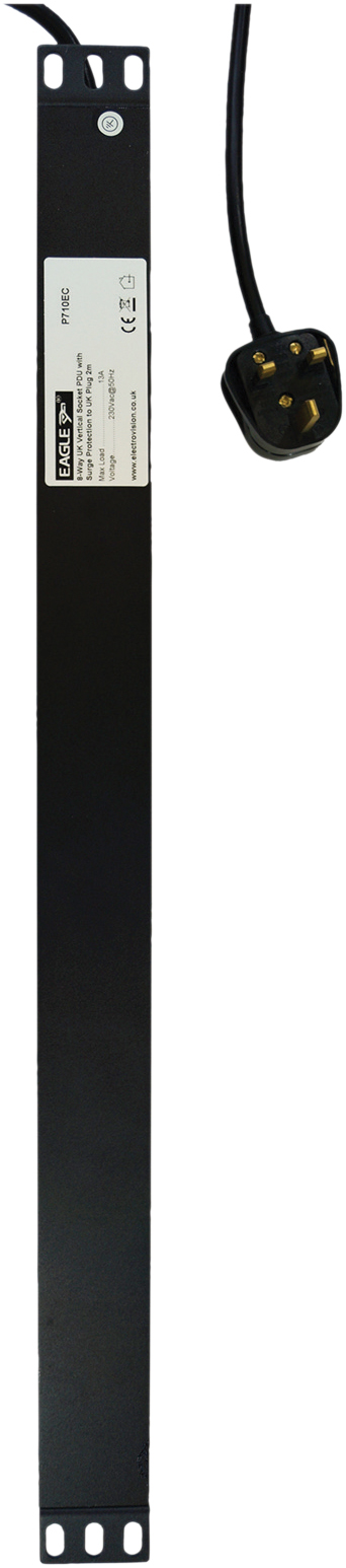 The Eagle 8-Way UK Horizontal PDU with Surge Protection features Eight (8) 13A UK Socket outlets with a 13A Fused UK Plug, a 1U high design and an illuminated power Switch with protection cover. The product is design for use with most 19 Inch Network cabinets, vertically. Indoor Use only