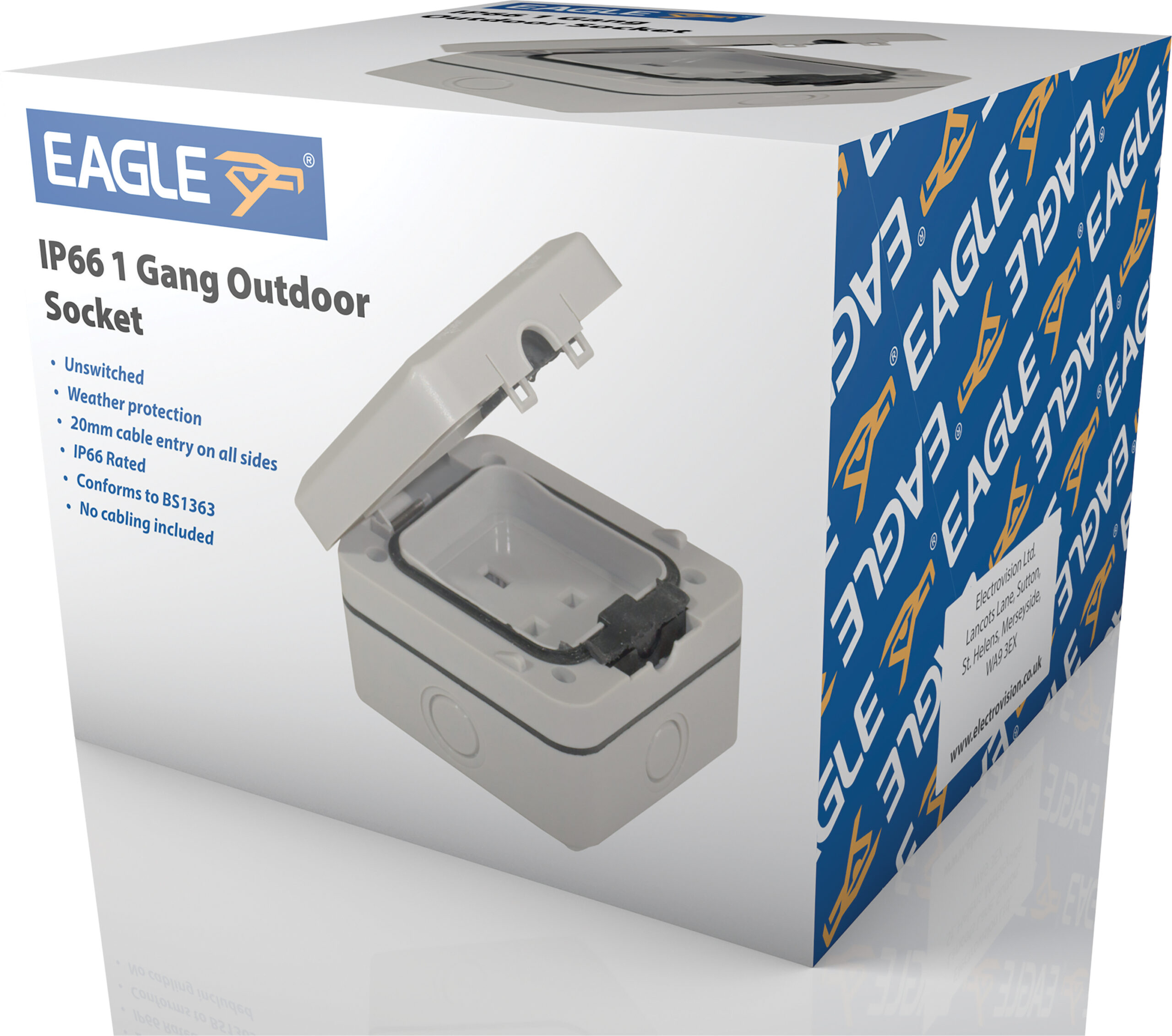Weather Resistant 1-Gang Unswitched Outdoor Socket 13A. Ideal for gardens, factories and industrial premises. The IP66 rated enclosure gives a high level of protection against ingress from weather, water jets and dust, enabling the safe operation of connected items. Consult the help of a professional prior to installation . Unswitched IP 66 Weather protection 20mm cable entry on all sides Rugged High Impact Resistance Moulded Housing