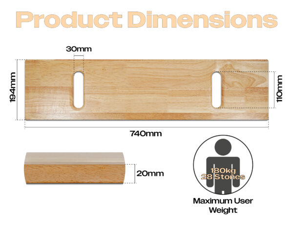 The Patient Transfer Board is made from high quality oak wood and will assist patients transferring from a commode or wheelchair into a bed, car, onto a toilet and bath. There are a wide range of uses for this board. It allows a carer to safely move patients or relatives safely and with reduced risk of injury. There are integral handles on the board for easy positioning and transport. It has a smooth finish to allow easy transfer. Maximum user weight limit is 180kg (28 stones).