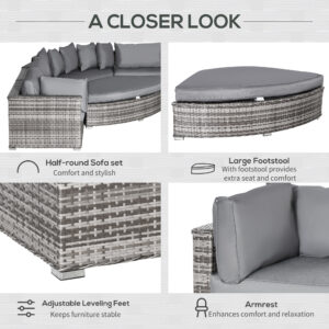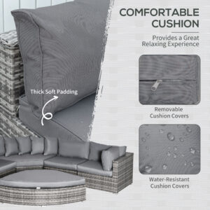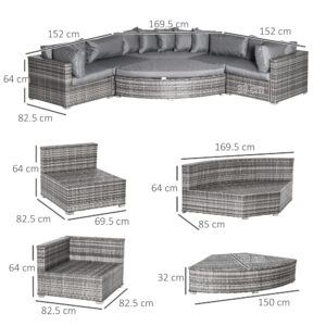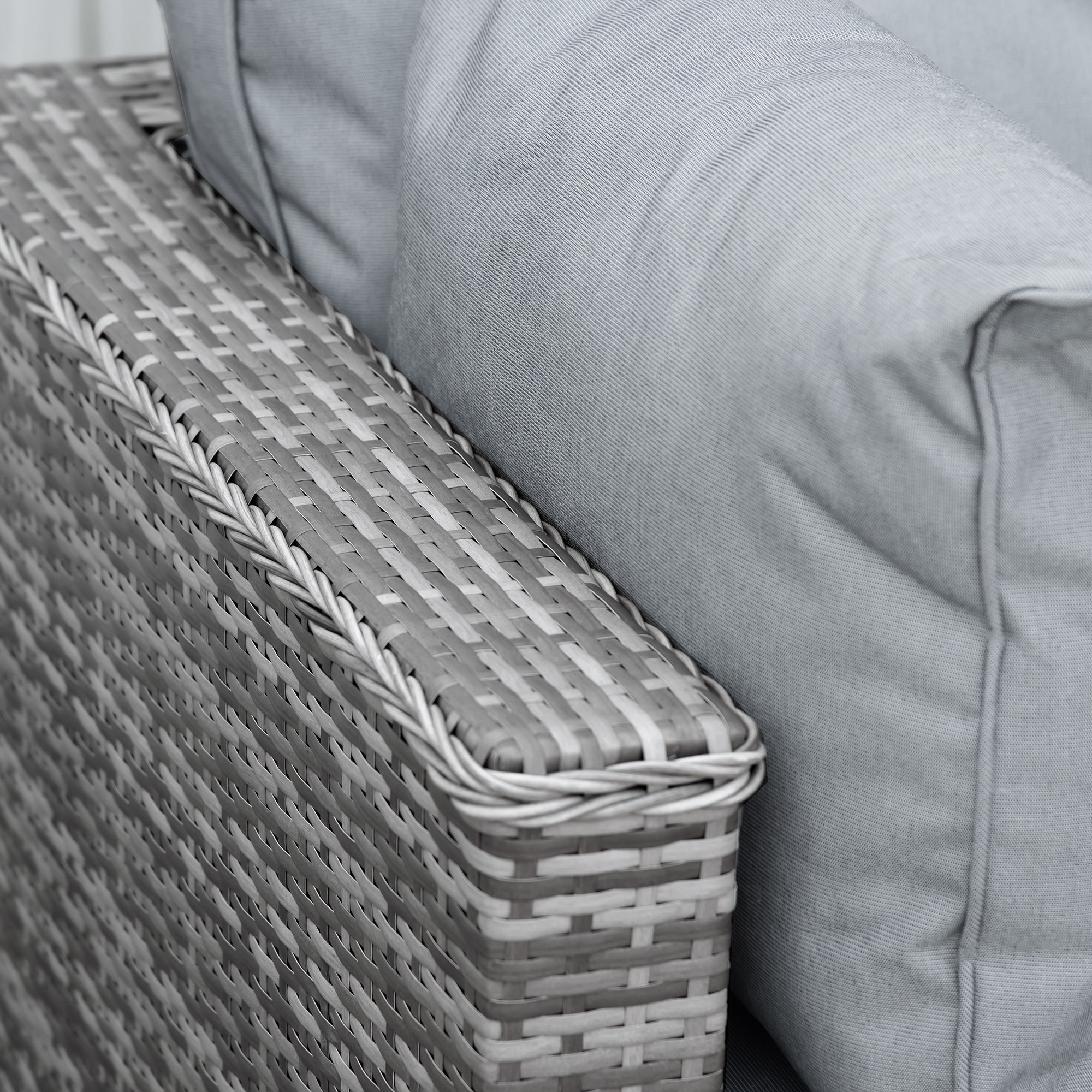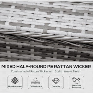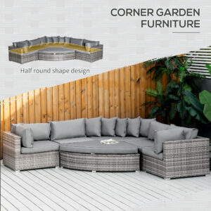 This outdoor corner sofa from Outsunny, combining modern style with high quality construction. Each frame of the conservatory furniture is made from metal for strength, wrapped in beautiful weather-resistant PE rattan, doubling the durability. There are seat and back cushions on each seat and footstool, making your time spent relaxing very comfortable. Stylish and modern design, relaxing to sit in and easy to keep looking its best – what more could you want from an outdoor seating set?!