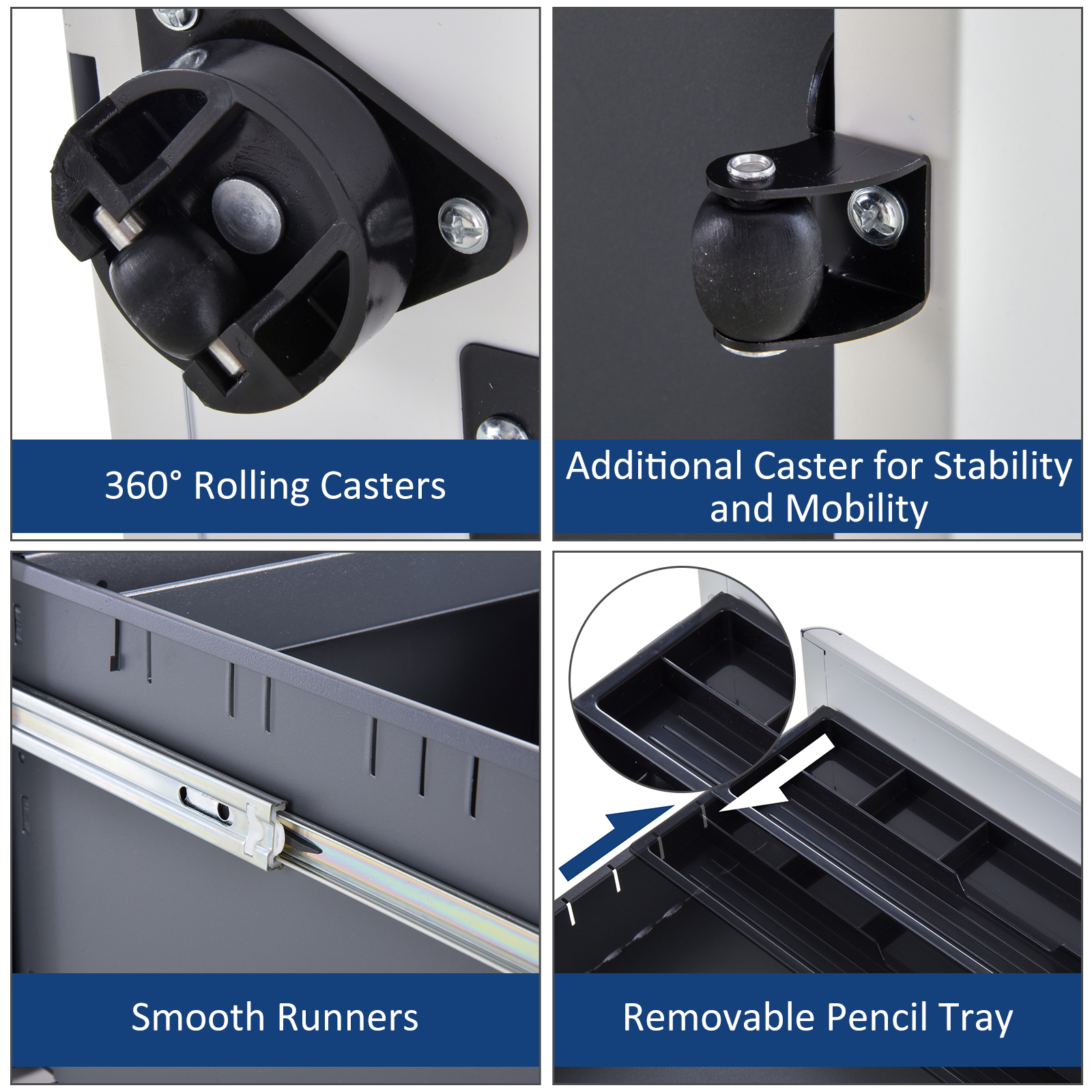 - A middle supporting wheel to prevent unit tipping over when drawers are open