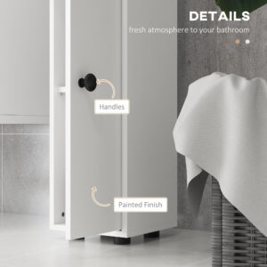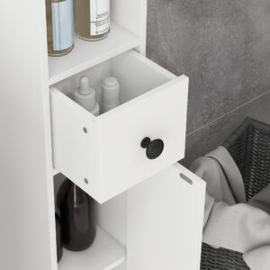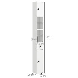 Small bathrooms are always in need of efficient storage. With this kleankin cabinet, you get exactly that. The 180 x 20cm size makes it a tall, narrow piece; featuring a top and bottom cupboard, drawer and four open shelves, it provides plenty of storage for bathroom essentials. The particle board structure is sturdy, with a mealine coating for light protection against everyday wear. The clean white design gives it a modern, versatile look.