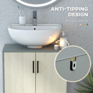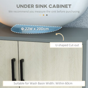Bring Farmhouse style into your bathroom, whilst saving space: look to this HOMCOM under sink bathroom cabinet. It comes with a ‘U’ shaped cut-out hole, which slots into the sink pipe. It features inner storage – a middle shelf which thus creates two handy areas for toiletries, towels, cleaning products are more. The four legs elevate the sink cabinet and make it easy to clean underneath. Complete with metal handles to open and close the doors easily.