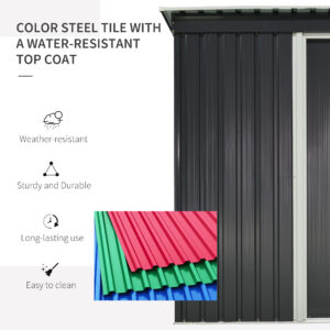 Small-medium tools and equipment easily stored with this Outsunny outdoor storage shed. The 76 x 150cm inner storage is accessed easily with the single sliding door: pull it to open/close easily. Made from galvanised steel, this metal storage shed is strong and suitable for year-round outdoor use. With a sloped roof, they’ll be as little water build-up on the roof, helping to preventing leaking through to inside.