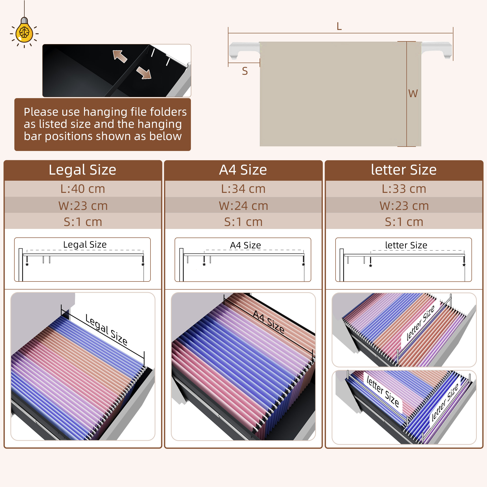 - Adjustable hanging bar in both drawers for letter, A4 and legal sized files