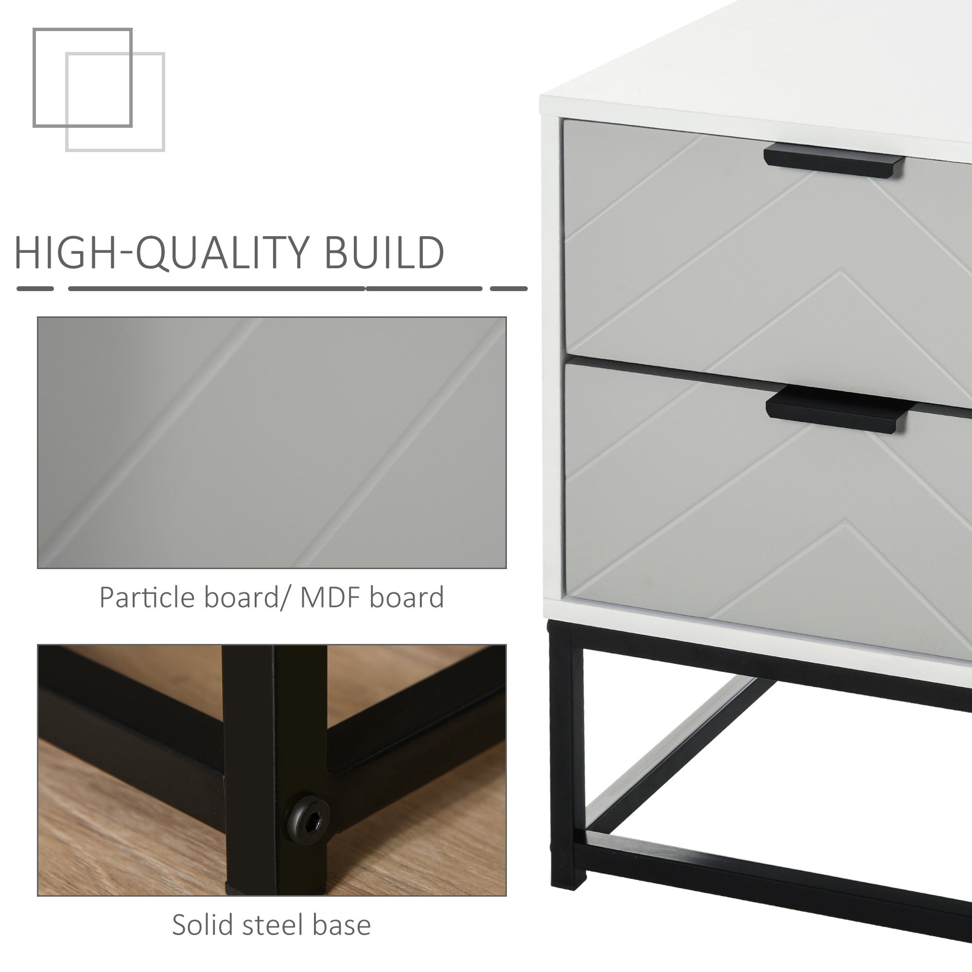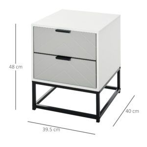 Keep stylish bedroom storage at the top of its game with this bedside table from HOMCOM. It’s made with two drawers to give you handy storage room for all your bedtime essentials, with the inner metal runners and handles making them easy to open and close. The neutral grey and white colour scheme is versatile, with each drawer featuring an embossed chevron pattern for a unique look which will stand proudly for years to come. A large metal frame on the bottom to keep the table steady and protecting the bottom from damage. Subtle and unique styling done at its best.