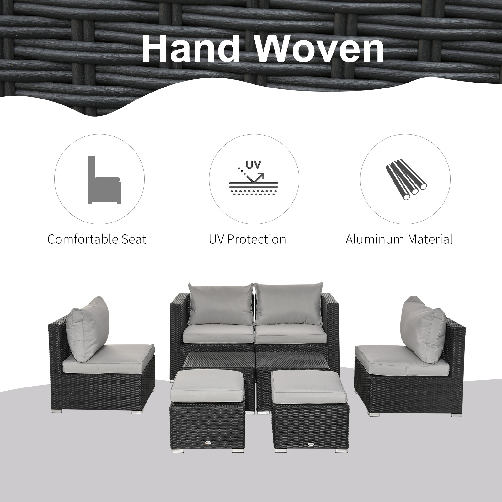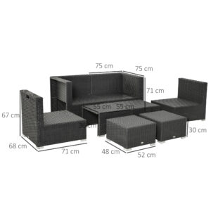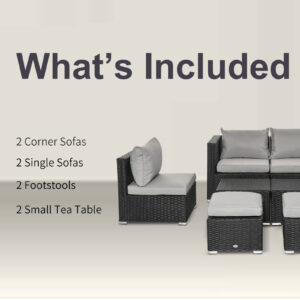 Take comfort to your garden with this eight-piece outdoor furniture from Outsunny. Powder coated steel frames make each piece strong and supportive, wrapped in plastic wicker for a stylish rattan look; also creates a protective shell. Set comes with two armless chairs, two footstools and two square tables – seats up to six people. Compact design: footstools fit under the tables and armless chairs fit into the corner chairs.