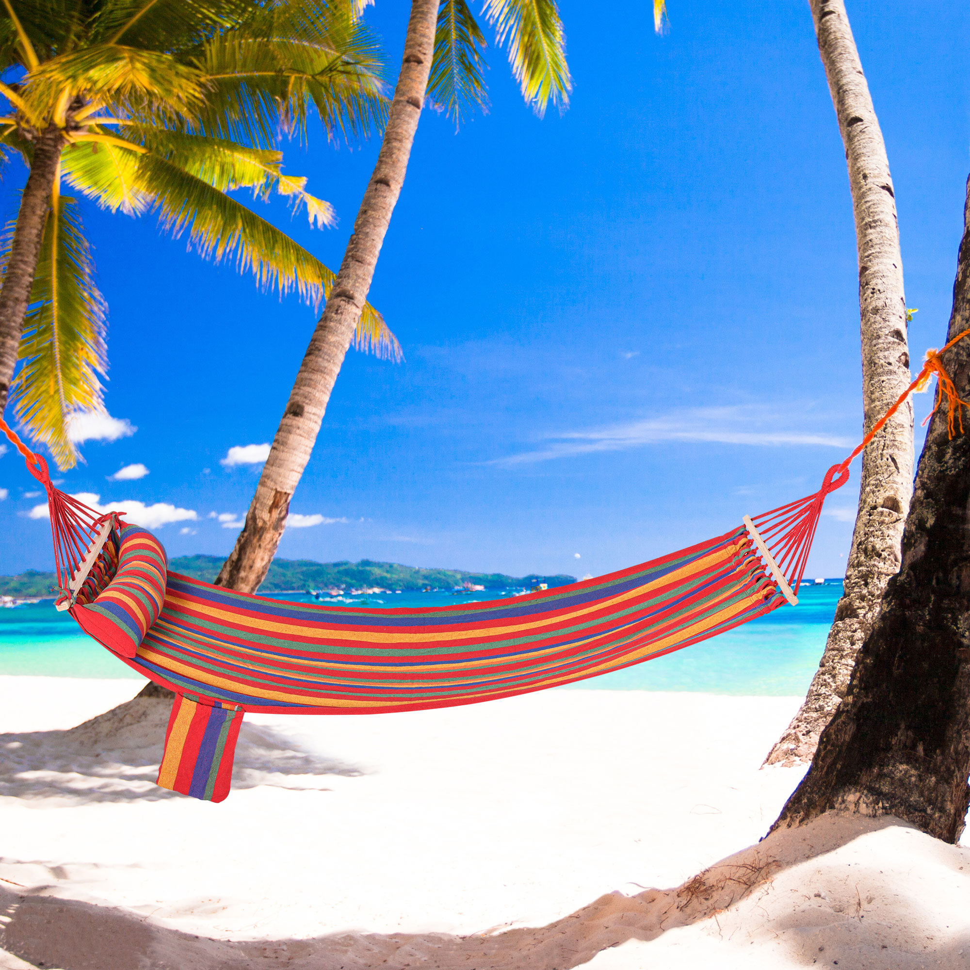 Make the most of the outside and relax comfortably for hours on end with this string hammock from Outsunny. Made from a cotton and polyester blend to ensure strength and sturdiness, the bedroom hammock is finished in a vibrant multicolored design that will look beautiful placed anywhere. Our swing hammock is ideal gift for friends, kids, lovers, father, mother, traveler, beach visitors, tent campers who loves hiking, camping, climbing, boating, traveling, picnic, or garden and yard use.