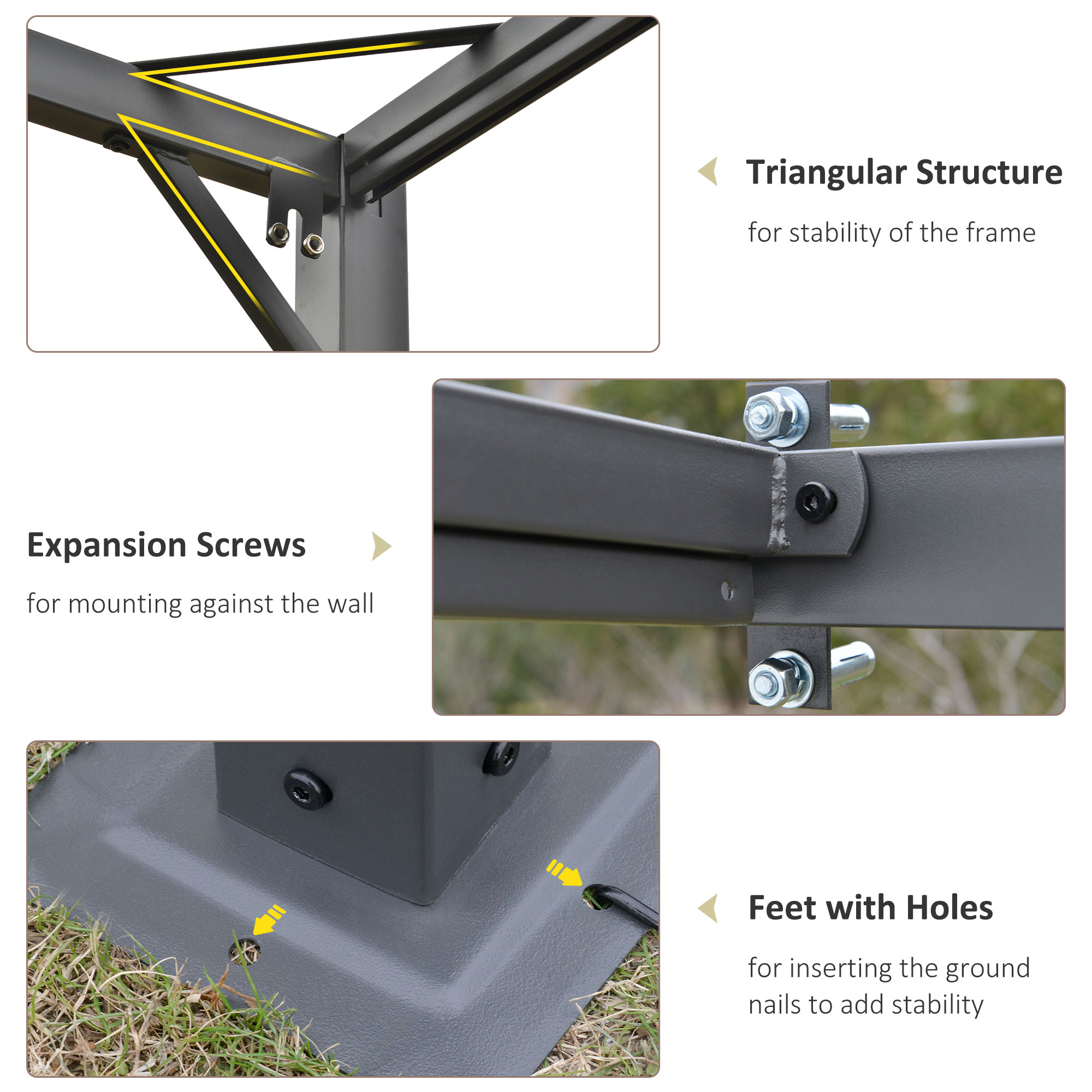 - Metal frame for a stable standing structure. Ground stakes included to pin to ground