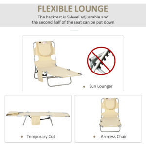 A cool update on the foldable sun lounger from Outsunny. Features a padded head hole at the front to allows you to rest your face in comfortably, which is perfect for relaxing or even reading a book! The powder coated steel frame is strong and solid to support up to 120 kg. The reclining backrest is five positions adjustable, easy to set and lock to a position you like best. Complete with a handy side pocket.