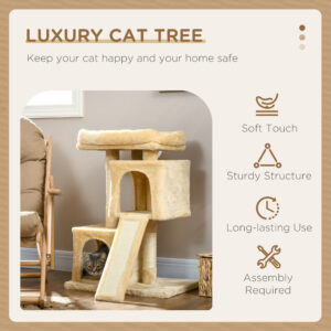Whether your cat is feeling a bit mischievous or sleepy, this luxury cat tree will fulfill their needs. The frame is made from particle board, ensuring a reliable structure, and it features sisal scratching posts, a sisal scratching platform, two large houses and a large top cushioned perch. It is covered in soft plush, which makes this tree soft and safe for your pet. It’s finished with a large base to keep it upright and in place. An activity centre for them to adore all day and night long.