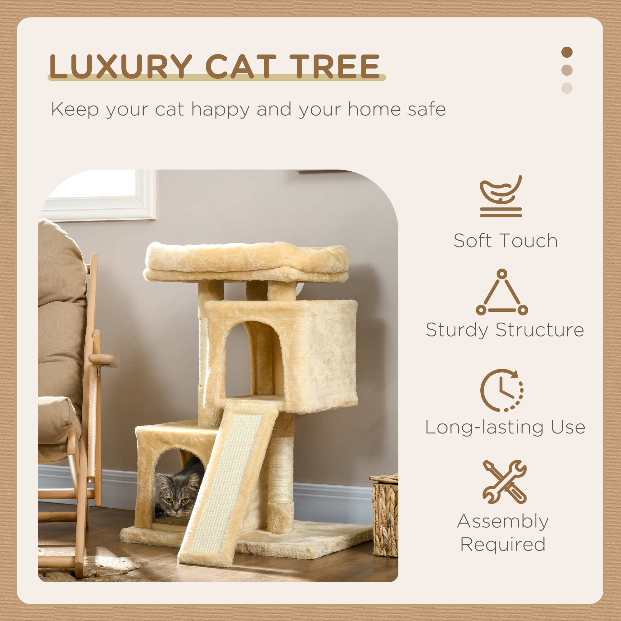 - Features two large houses, several sisal scratching posts and a large top cushioned perch