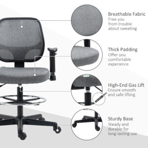 Ensure you’re working comfortably when using taller surfaces with this draughtsman chair from Vinsetto. It’s made from quality materials: soft fabric, thick sponge and a solid frame so it can used every day. Adjustable sturdy seat height and armrest height to cater for you, with a footrest so your legs aren’t dangling. A must-have piece to increase work productivity.