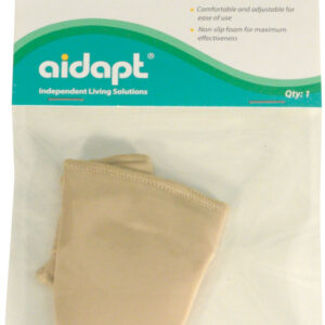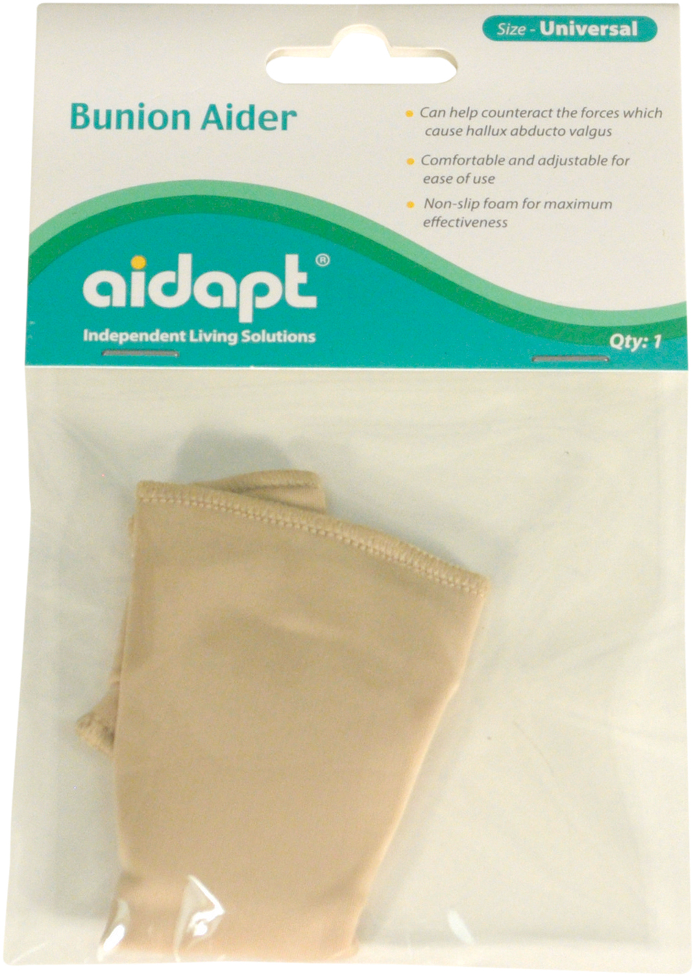 The Aidapt Bunion Aider is an elasticated sleeve with a gel pad which is worn over the toes providing cushioning and protective padding. The gel padding protects the sensitive area of the forefoot from impact and stress. It s discreet design enables it to be worn under socks and hosiery. It is ideal for everyday use. Can be worn on either foot or on hands to protect thumbs. Universal size. Can be hand washed with a mild detergent.