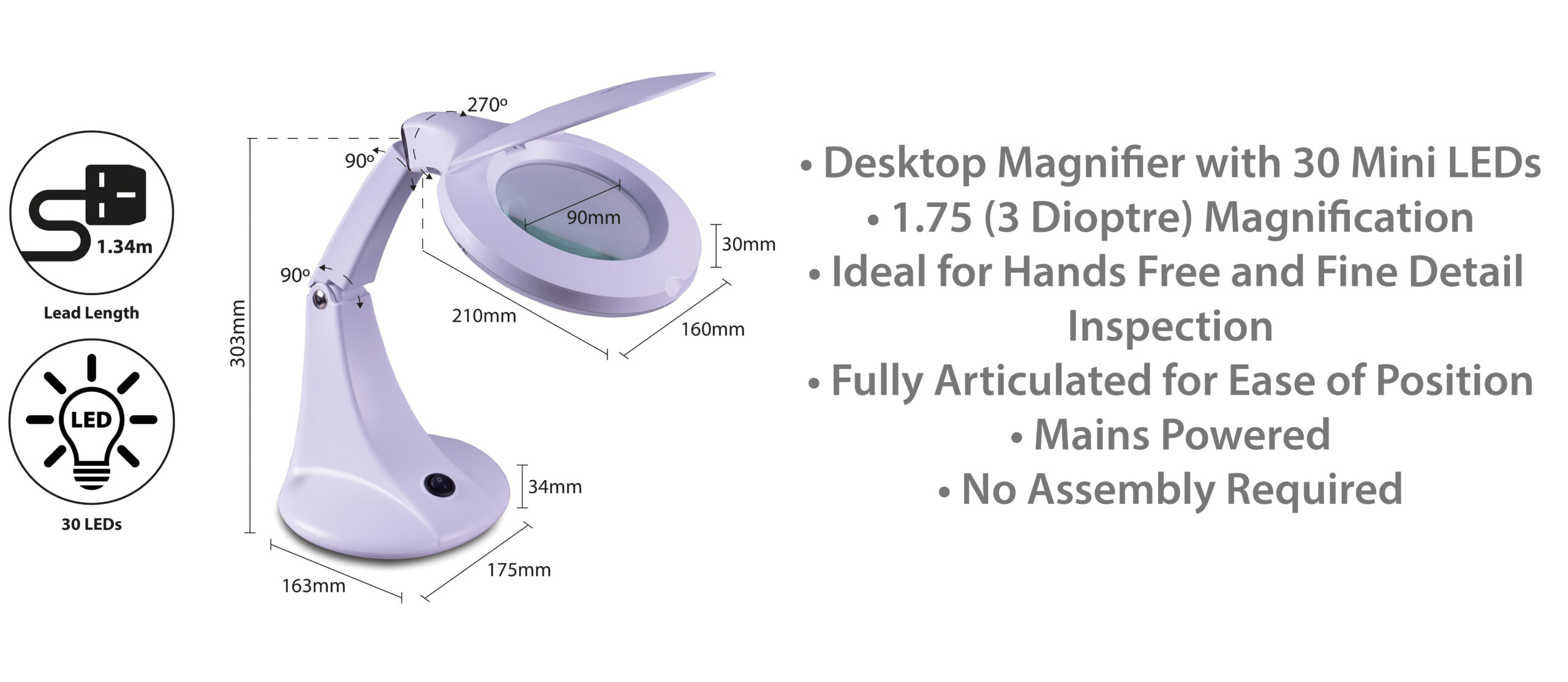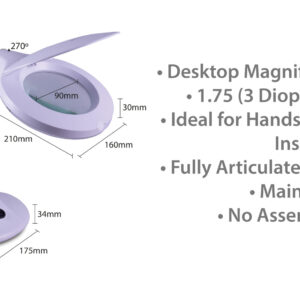 This illuminated magnifier has been designed with the idea of maximising desktop space while still offering outstanding performance. The product uses a 4″ triple function lens which provides magnification of either 1.75x (3 Dioptre) 2.25x (5 Dioptre) or 4x (12 Dioptre) depending on which part of the lens you look through. This makes the magnifier ideal for a range of fine detail projects and allows you to see intricate details and smaller prints with absolute clarity. Constructed from robust materials the unit features LED illumination, pivoting head, a double arm for easy positioning, flip up lens cover, heavy base and on/off switch. The product has a multitude of applications and is the ideal choice for use in offices, homes, laboratories and schools.