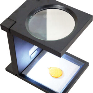 A hands free 110mm lens with 2.5 x magnification, this magnifier is based on the original linen tester style magnifier. Fitted with 2 x LED lights to offer brightness when in use. This magnifier requires 3 x AAA batteries (not supplied) and is easily workable with an on/off switch. The edges are fitted with ruling edges of up to 10cm or 4 inches, which can be useful for working on a range of projects. The free standing design makes it a sturdy option when mounted on a steady surface such as a table top. Another helpful feature of this magnifier is that it is foldable to pocket size.