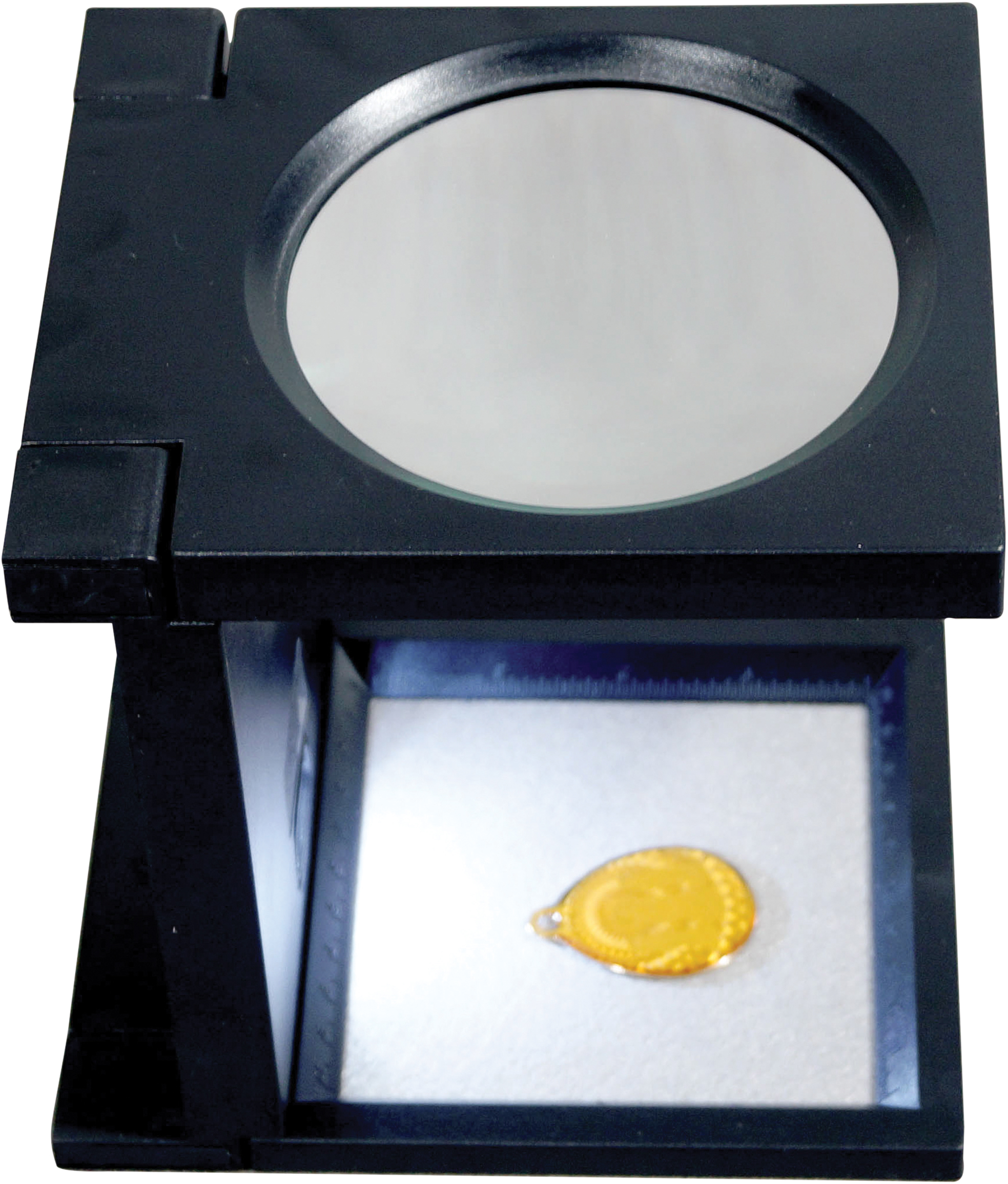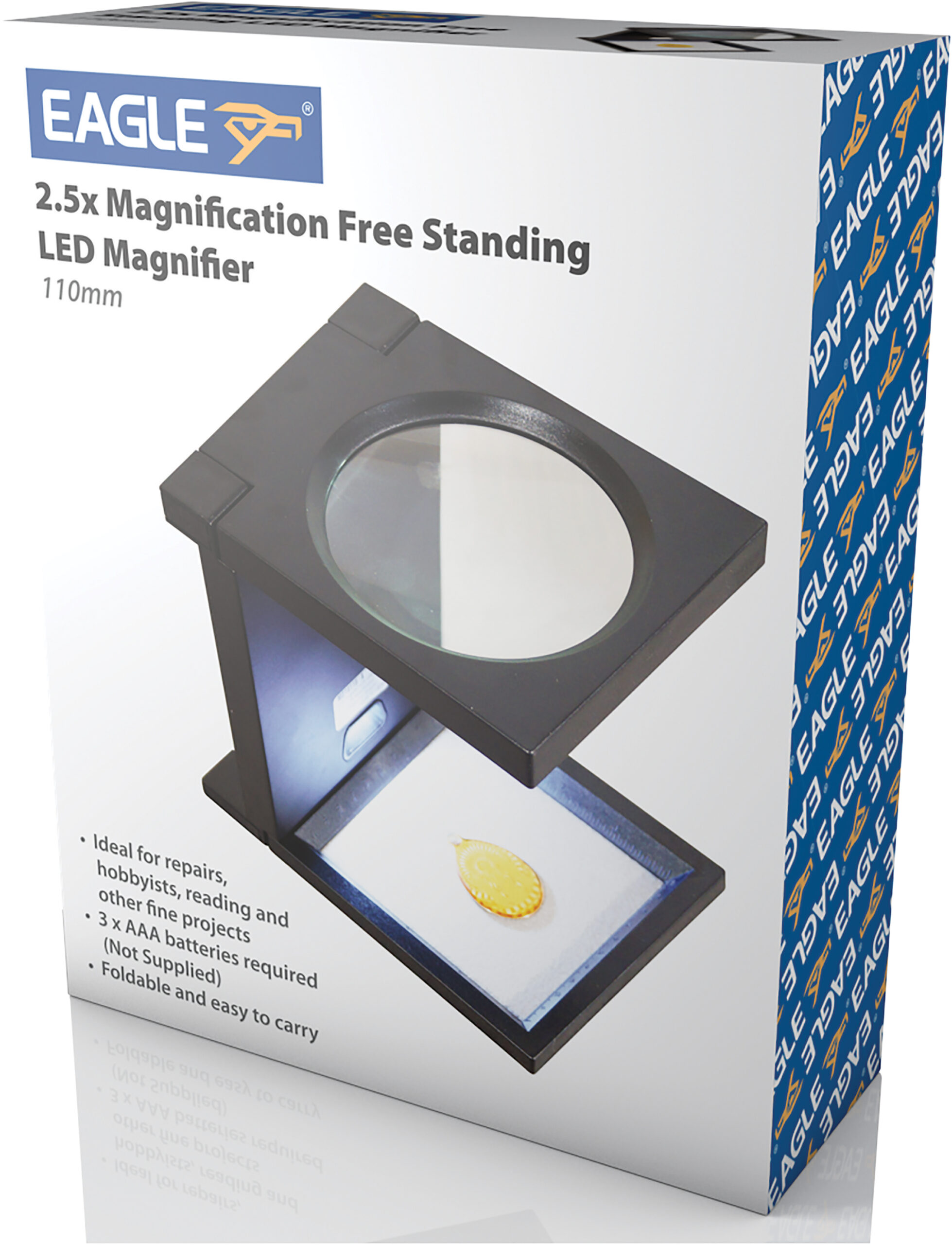 A hands free 110mm lens with 2.5 x magnification, this magnifier is based on the original linen tester style magnifier. Fitted with 2 x LED lights to offer brightness when in use. This magnifier requires 3 x AAA batteries (not supplied) and is easily workable with an on/off switch. The edges are fitted with ruling edges of up to 10cm or 4 inches, which can be useful for working on a range of projects. The free standing design makes it a sturdy option when mounted on a steady surface such as a table top. Another helpful feature of this magnifier is that it is foldable to pocket size.