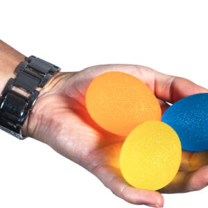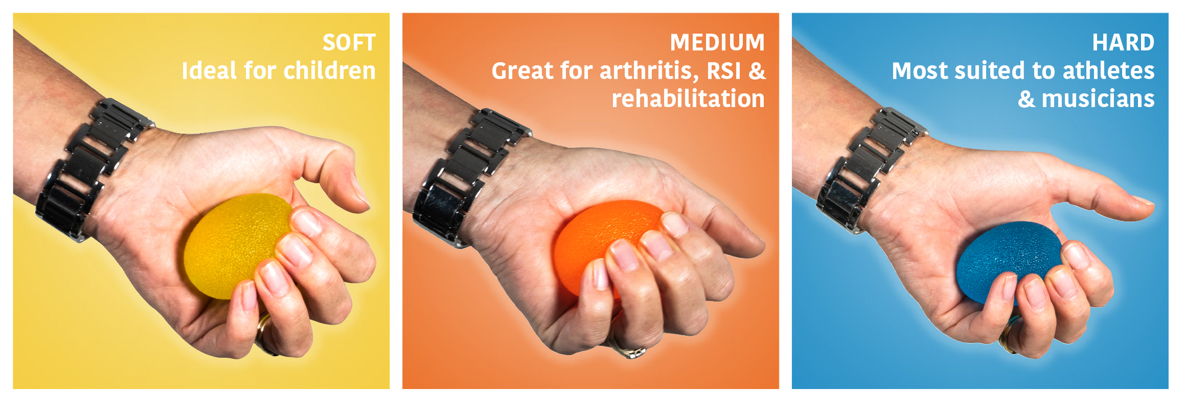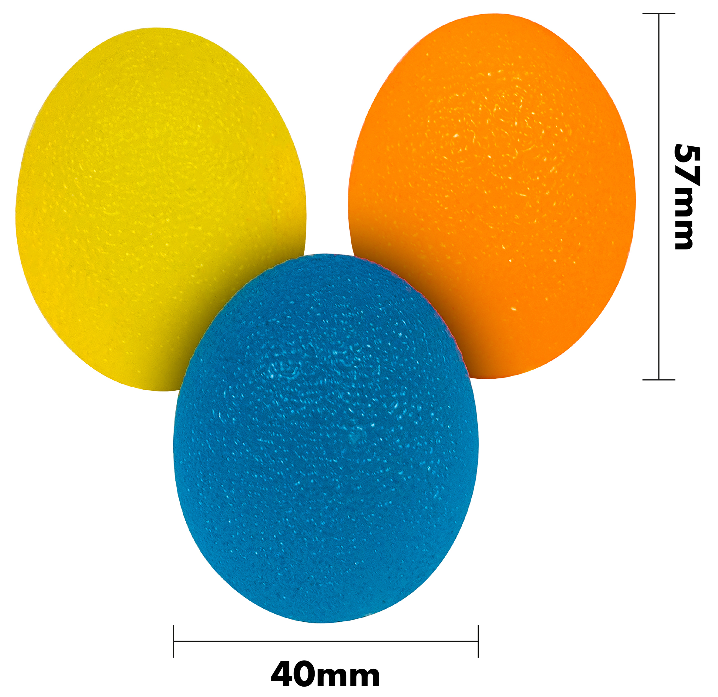 A pack of 3 oval shaped hand exercise and stress relief balls. These pleasantly coloured stress balls are supplied in 3 levels of progression, soft 15kg, middle 20kg and hard 30kg.Stress balls can be used to improve finger and grip strength and may be used by athletes, musicians, children and adults. Strength can be built in the hands of those with arthritis and repetitive strain injury or simply use in times of stress as a tool to calm your mind.The set contains 3 oval shaped balls with different levels of resistance. The soft 15kg egg is ideal for children and can help with fidgeting and anxiety, the medium 20kg is ideal for those with arthritis, repetitive strain or rehabilitation needs and the hard 30kg is most suited to athletes and musicians.