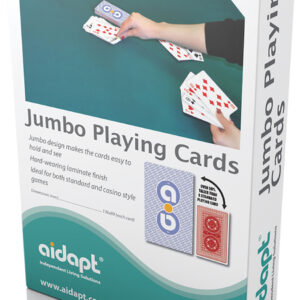 A pack of large print, jumbo playing cards that are more than 50% larger than average playing cards. The larger size and print makes the cards easier to hold and read meaning they are ideal for children, the elderley, those who are partially sighted or arthritis sufferers. Made from hard wearing materials and laminate coated.
