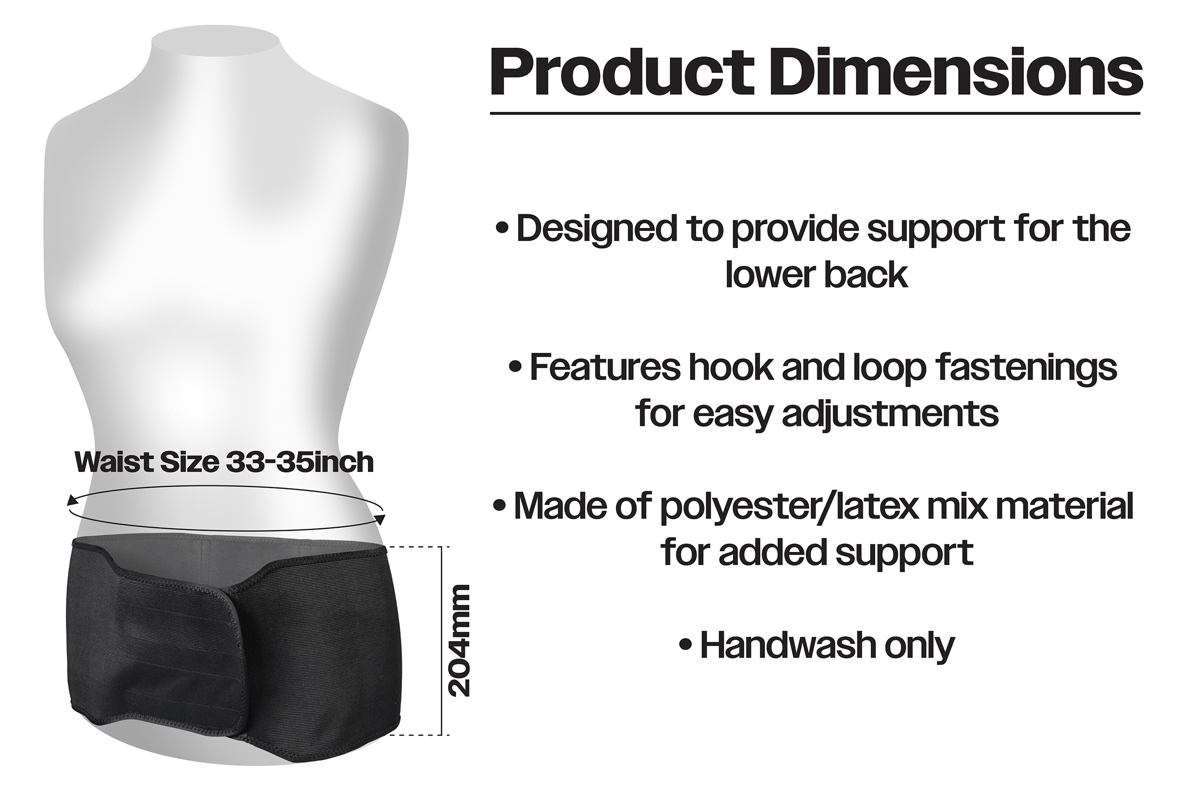 The lumbar support belt is available in three different sizes and comes in a sleek black color. It features a convenient hook and loop fastening system and should be handwashed for maintenance. Made from 70% polyester, 20% latex and 5% PP material, this belt provides excellent support for the lower back.