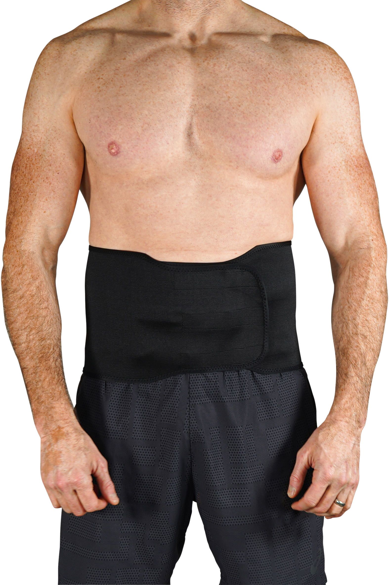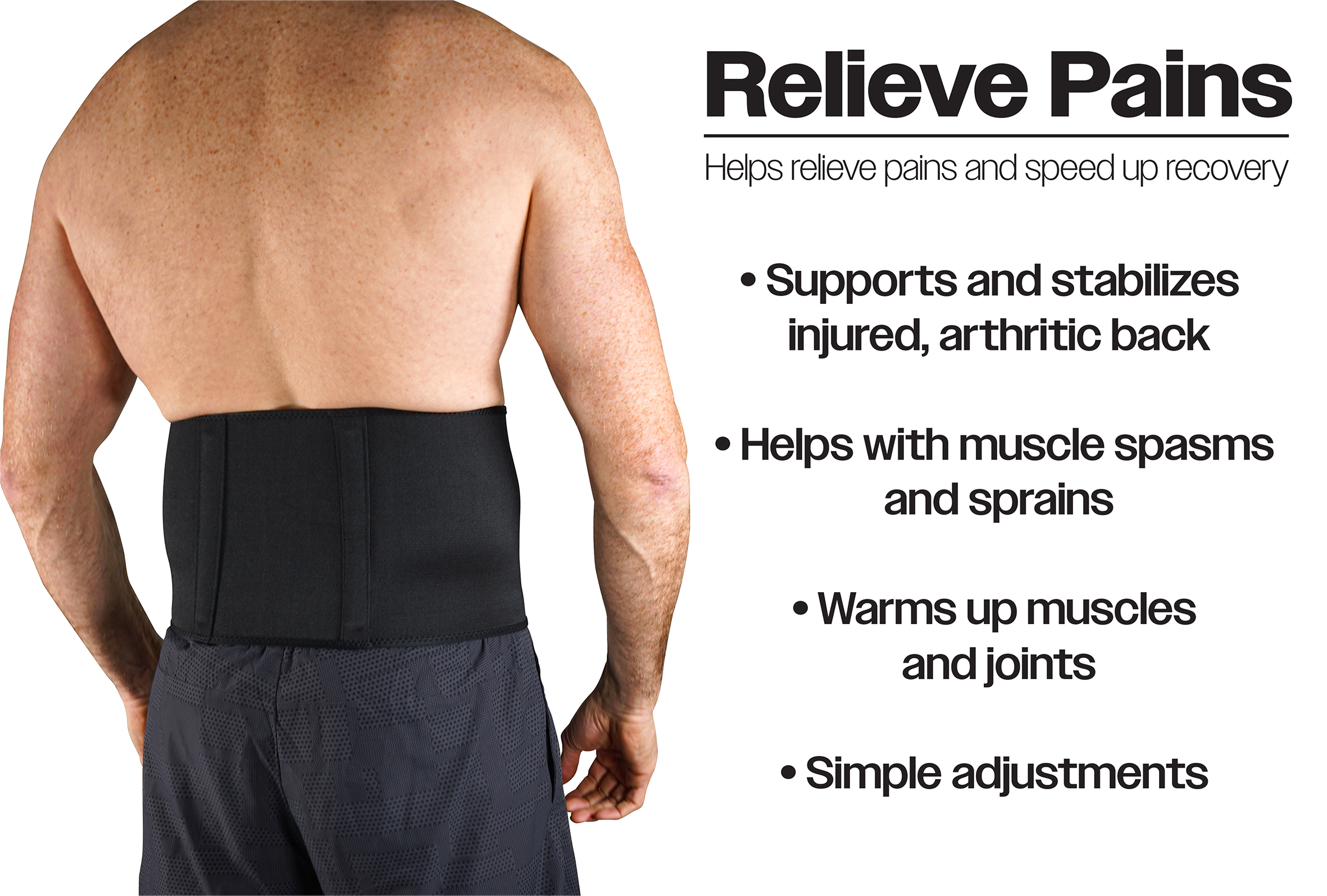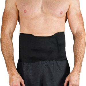 - Black lumbar support belt available in three sizes